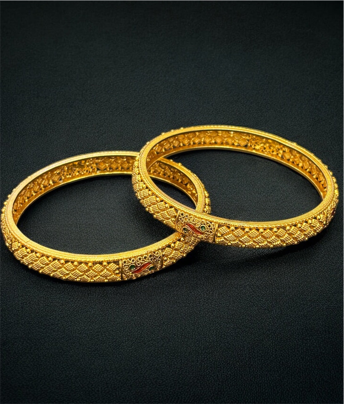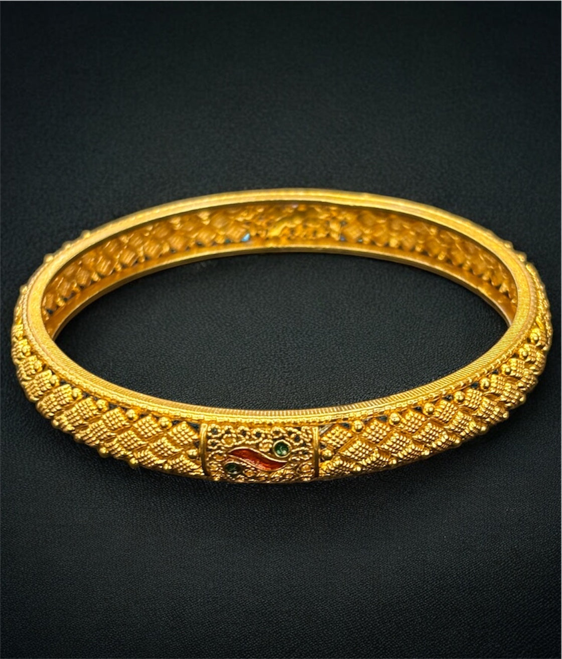 Elevate your elegance with this meticulously handcrafted bangle, designed with a stunning filigree work . Made from high-quality 92.5% sterling silver and dipped in 24 K gold this bangle features a attention grabbing design that gracefully wraps around your wrist. The intricate ornamentation on the bangle is sure to add a touch of sophistication to any look.