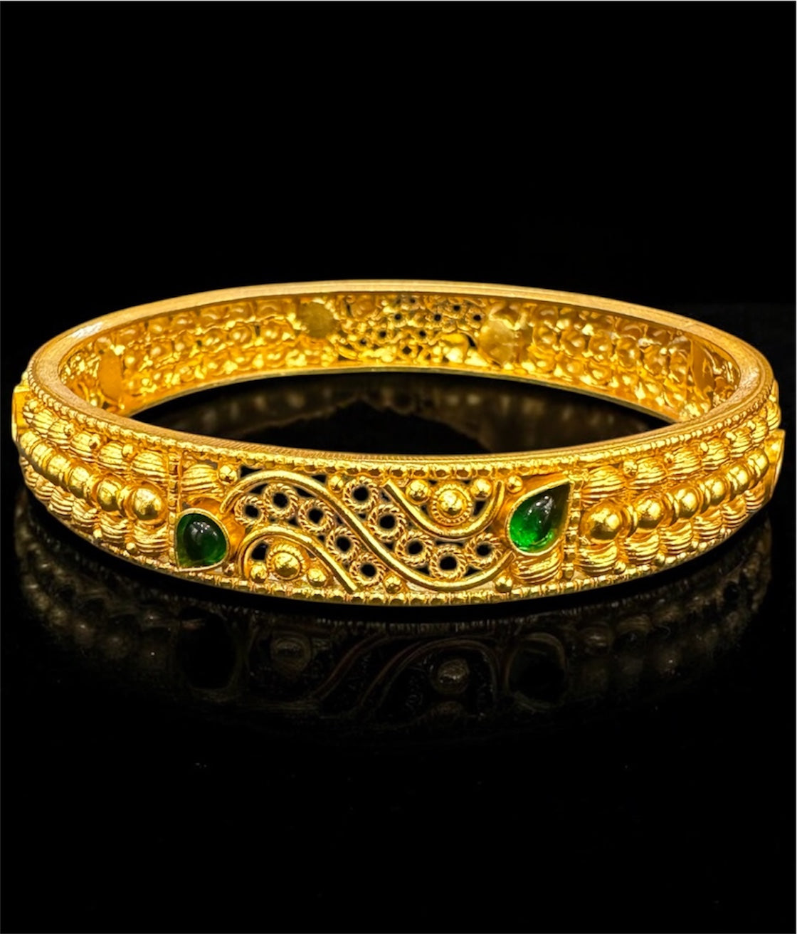 At the heart of the bangle lies a green kemp stone —chosen for its classic appeal. This kemp enhances the overall aesthetic with a graceful, understated glow, making the bangle suitable for both festive occasions and elevated everyday styling.