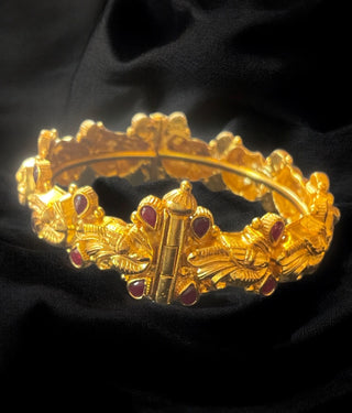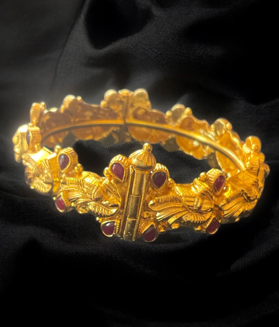 Each intricate detail is brought to life through painstaking craftsmanship, showcasing the finest nakshi (nakkasi) work. The kada is further accentuated with radiant kempu stones, adding a touch of regal charm and color. 24K gold plating gives it a rich, authentic finish that closely resembles real gold, making it perfect for traditional occasions, weddings, or festive celebrations.