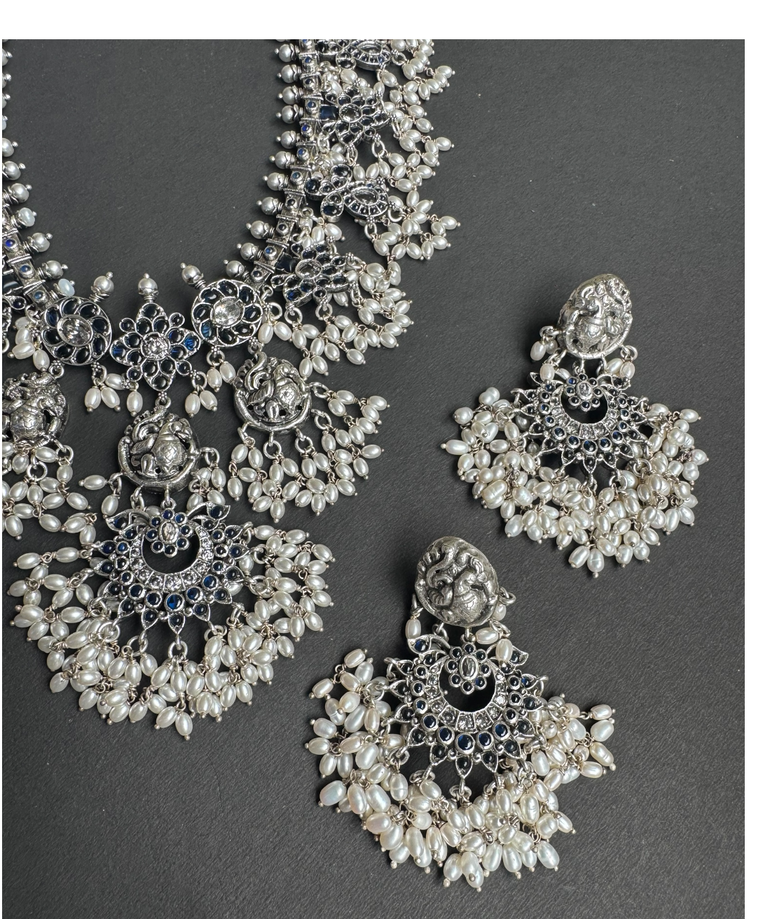 The Marala Silver Guttapusalu Necklace (Oxidised/Blue/Rice Pearl)
