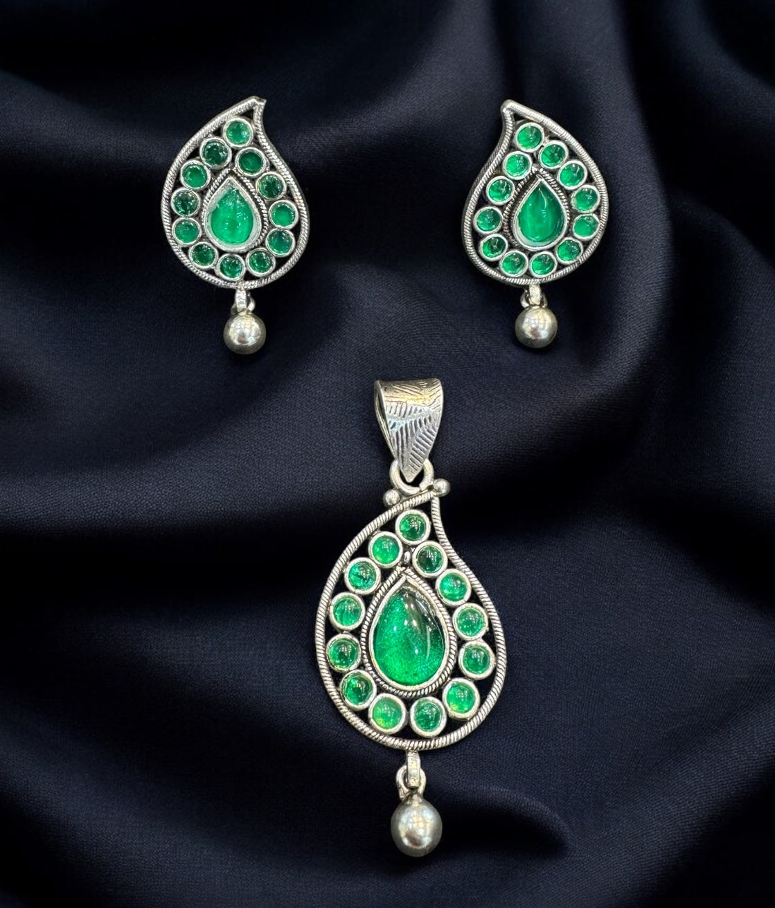 The Maavu Silver Green Kemp Mango Pendant & Earrings