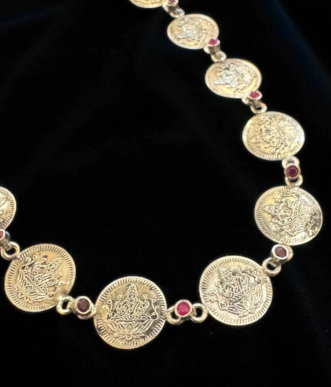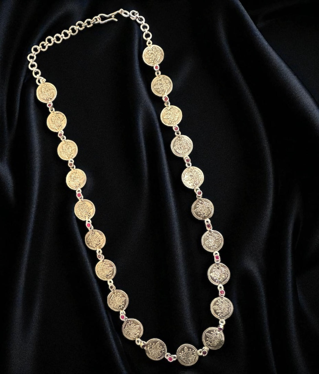 Crafted in pure 92.5 Sterling Silver, this necklace is a fine tribute to traditional South Indian temple artistry. The intricate kasu mala design—composed of antique-style silver coins—adds texture, movement, and historical richness, while the kemp stones evoke an aura of regal grandeur.
