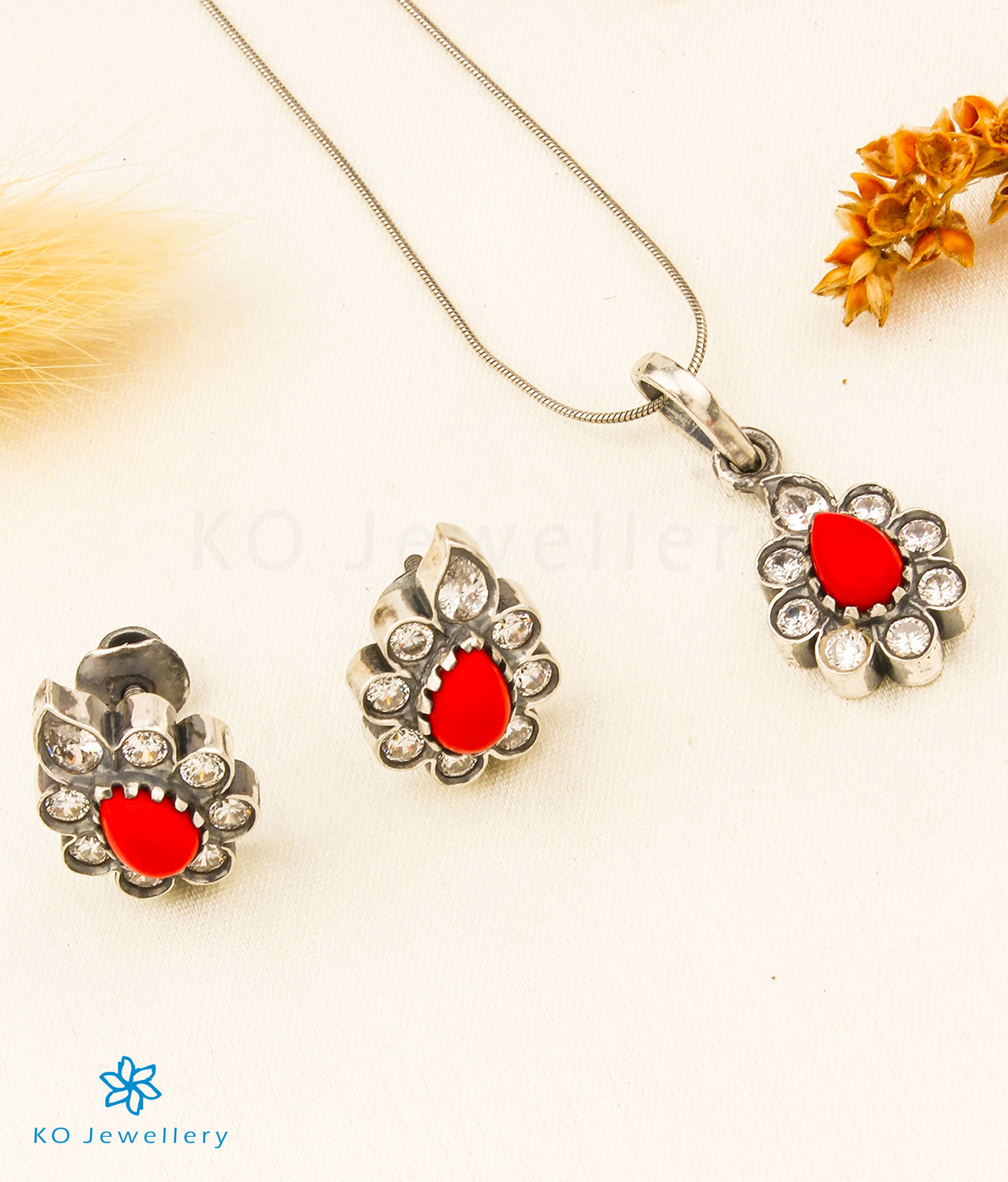 The Bhavika Silver Kemp Pendant Set (Oxidised/Coral)