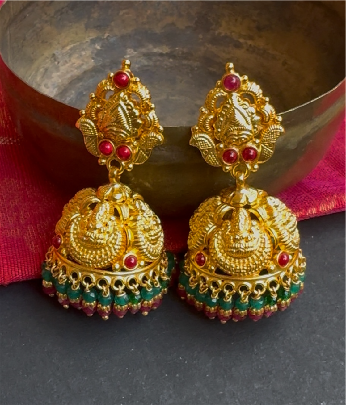 Crafted in 92.5 silver and dipped in 24k gold, this handcrafted Lakshmi-motif jhumka beautifully reflects the richness of traditional South Indian artistry. The intricate design highlights fine detailing, while the radiant red & green kemp stones add a touch of regal elegance.