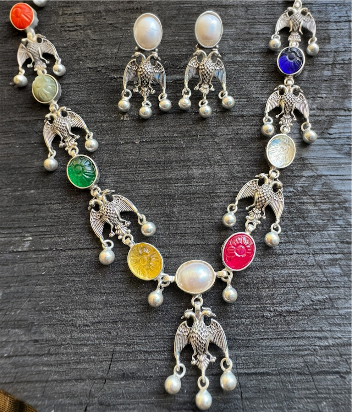 The Dvi-Paksha Silver Gandaberunda Navratna Necklace & Earrings