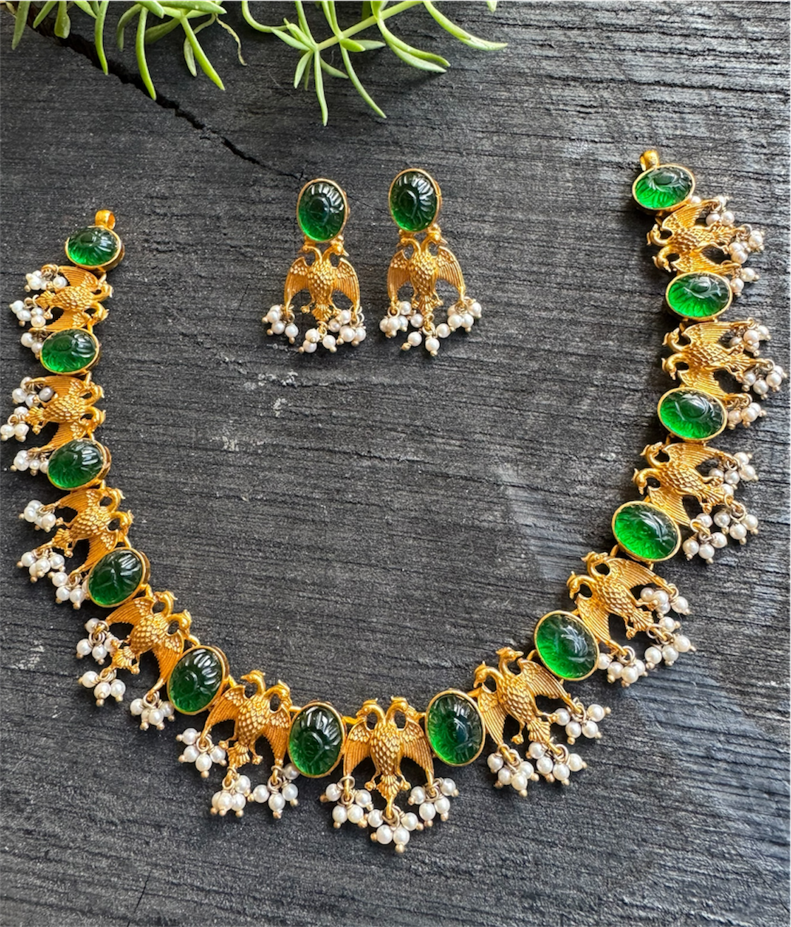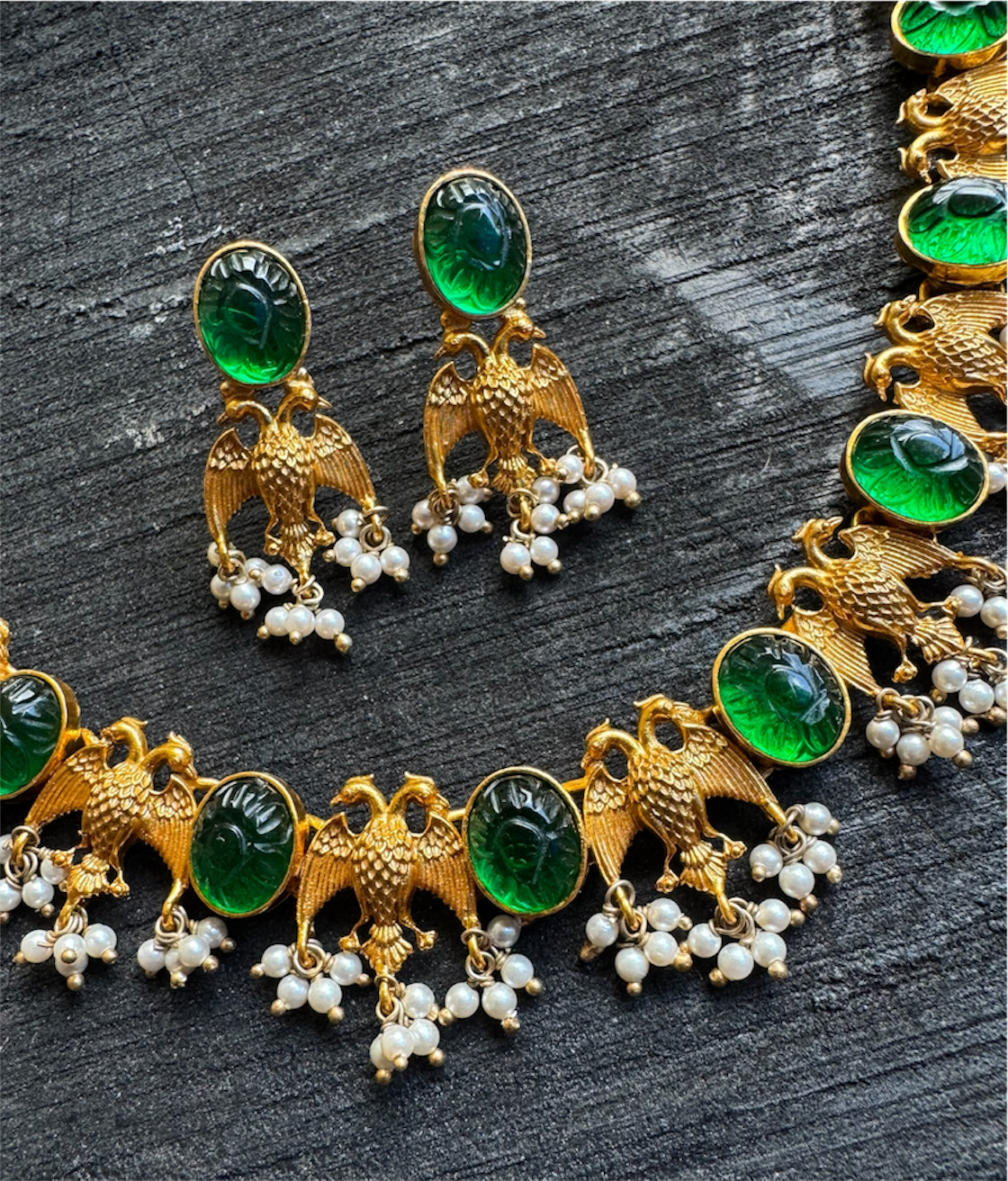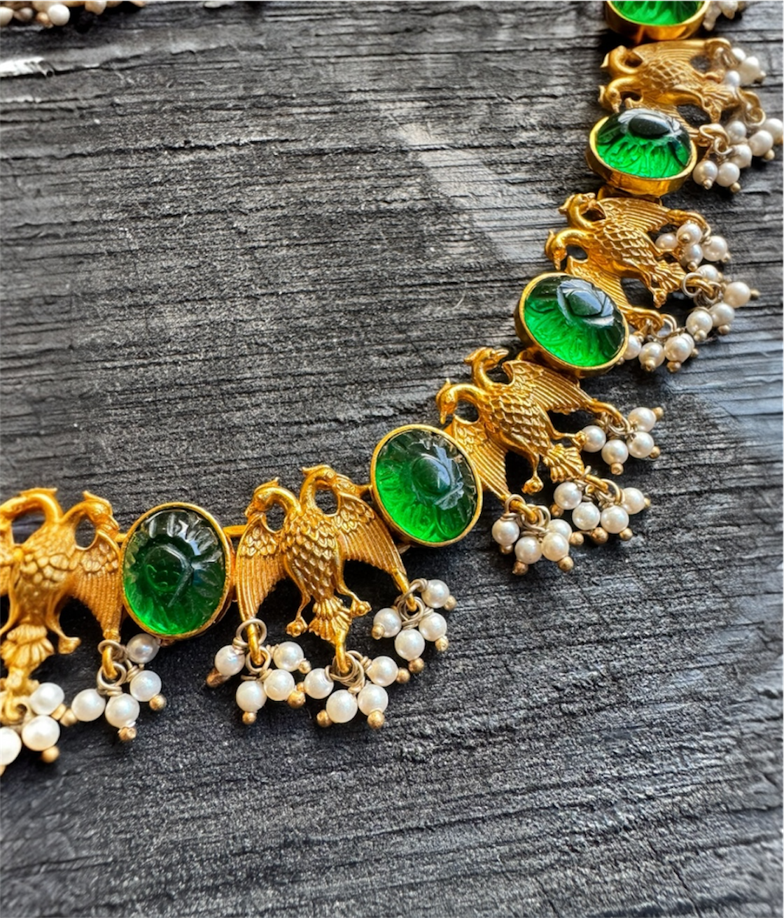 Step into the grandeur of South Indian heritage with our exquisitely handcrafted Gandaberunda Necklace, made in pure 92.5 sterling silver and finished with rich 24K gold dipping. The majestic twin-headed Gandaberunda (surrounded by beautiful pearl and kemp stone) —an ancient symbol of power, protection, and divine strength—forms the striking centrepiece of this design.