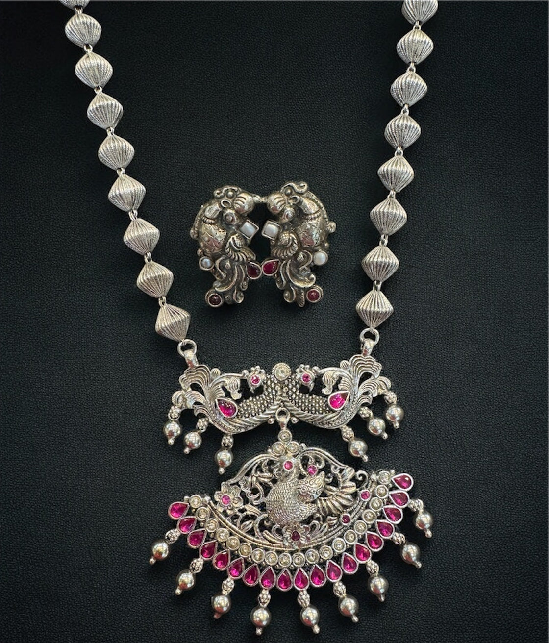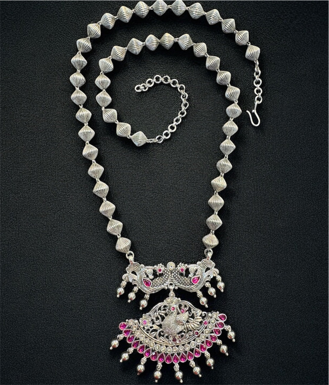 Embrace timeless elegance with this ornate peacock motif necklace, a stunning piece of traditional temple jewellery. The pendant, handcrafted from 92.5 sterling silver, features a graceful peacock design adorned with vibrant Kempu stones, symbolizing beauty and prosperity. The necklace string is made of silver beads arranged in an intricate pattern, enhancing its regal charm. this masterpiece blends heritage artistry with enduring sophistication — perfect for festive and bridal occasions.