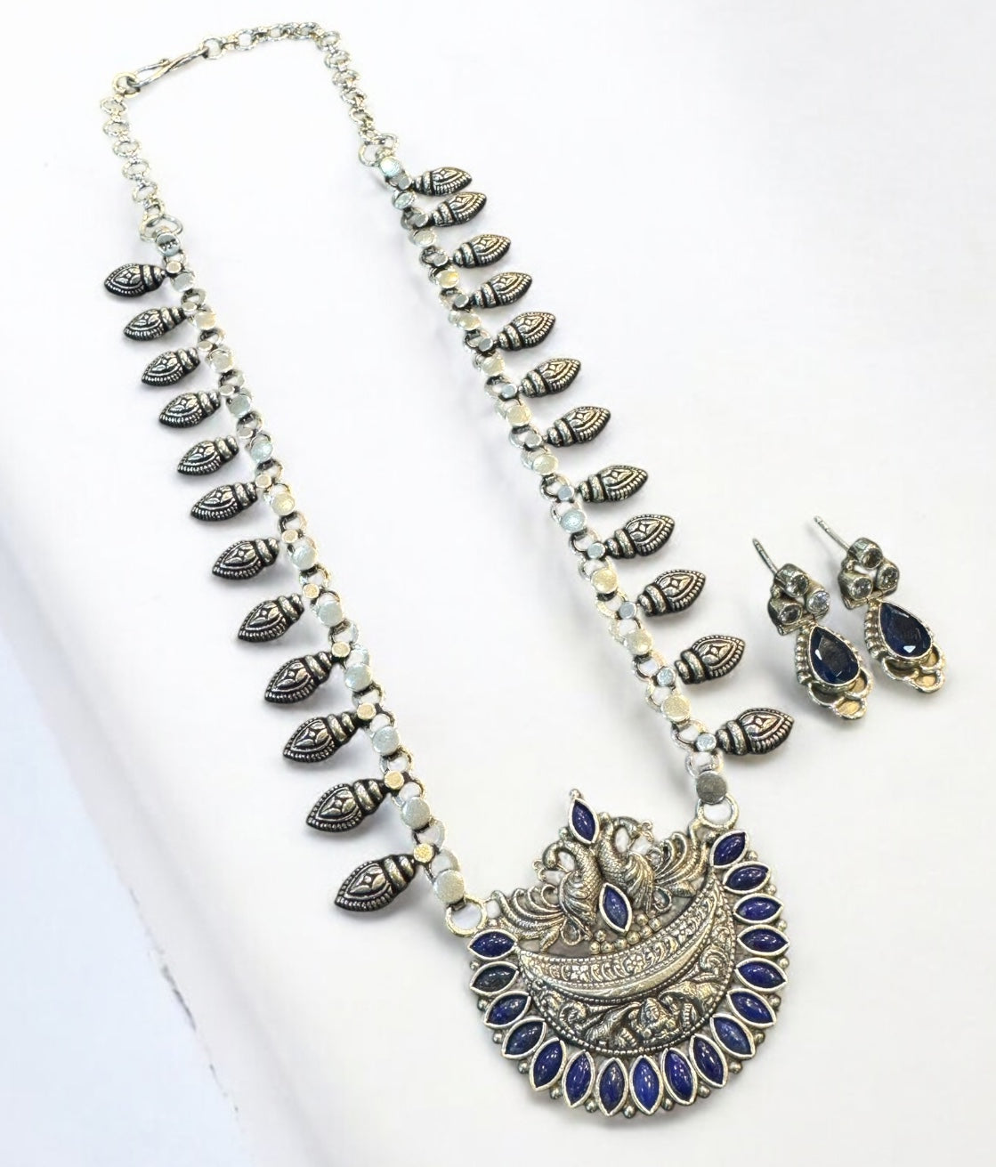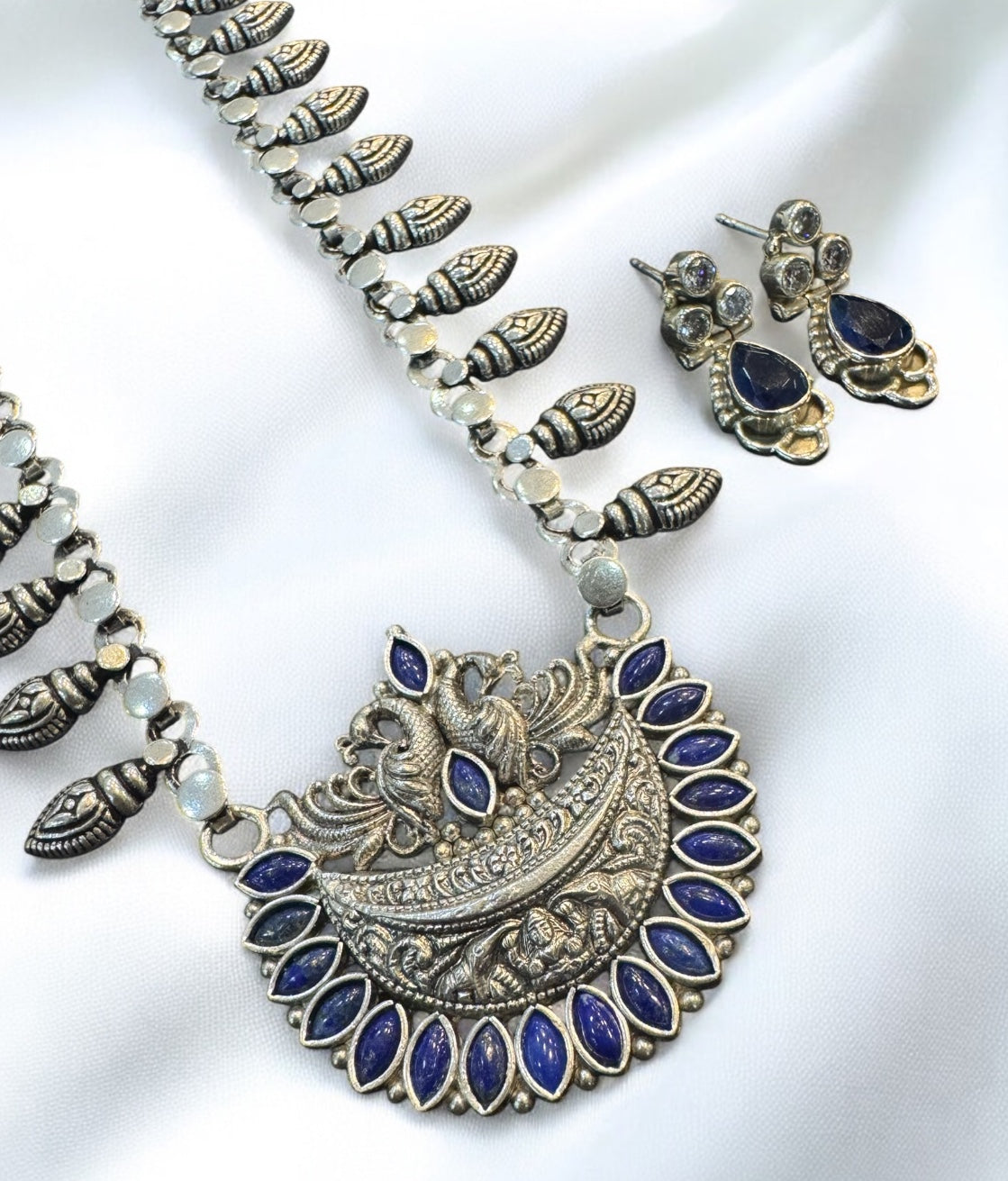 The Abhishti Nakshi Silver Blue Peacock Necklace & Earrings