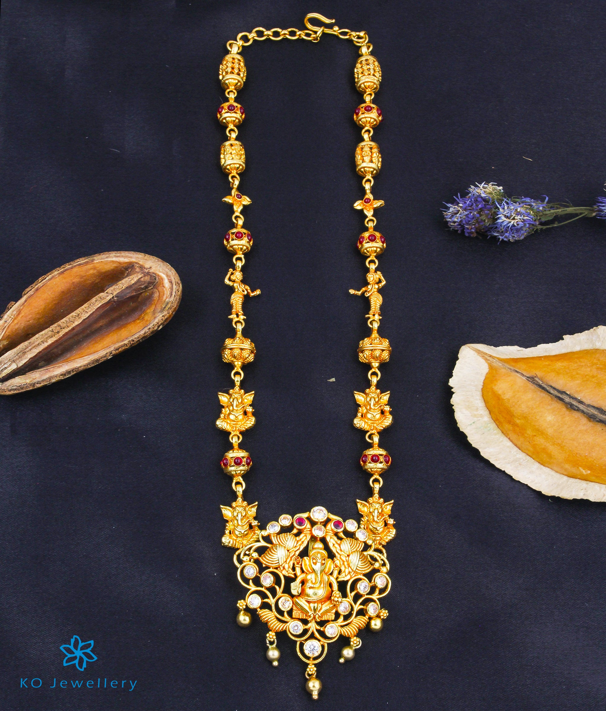 Meticulously sculpted in 92.5 sterling silver and lavishly dipped in 24K gold, the long necklace boasts a rich antique finish that enhances its timeless appeal. At its center is a striking three-dimensional repoussé pendant, showcasing Lord Ganesha flanked by twin peacocks in a graceful dance—symbols of beauty, grace, and divine connection. Complementing this focal point is a majestic rim lined with delicately carved peacocks, paying homage to the ornamental splendor of temple architecture.