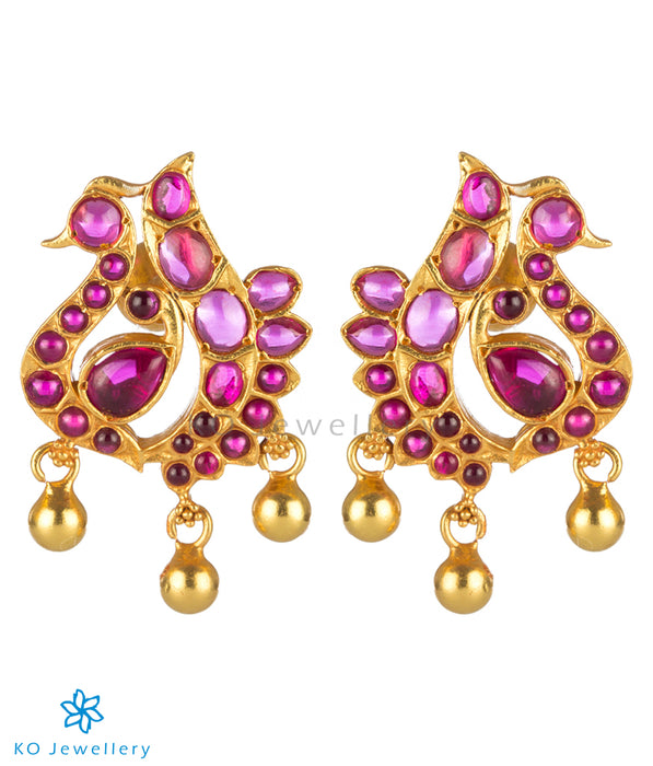 Pretty little peacocks in an ornate design, decorated with kempu stones make up this delightful pendant/earrings set .Handcrafted with care in Sterling Silver (92.5%) using techniques used in ancient South Indian antique jewellery the pendant/earrings are gold-dipped in a special process to give an antique look.