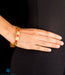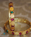 Make traditional chic more interesting with this bangle made up of coins depicting Laxmi the goddess of wealth. The intricate design and kempu stones make it more attractive. Handcrafted in pure Sterling Silver (92.5%) and dipped in 24-carat gold using techniques used in ancient South Indian antique jewellery. The price listed is for a single bangle.