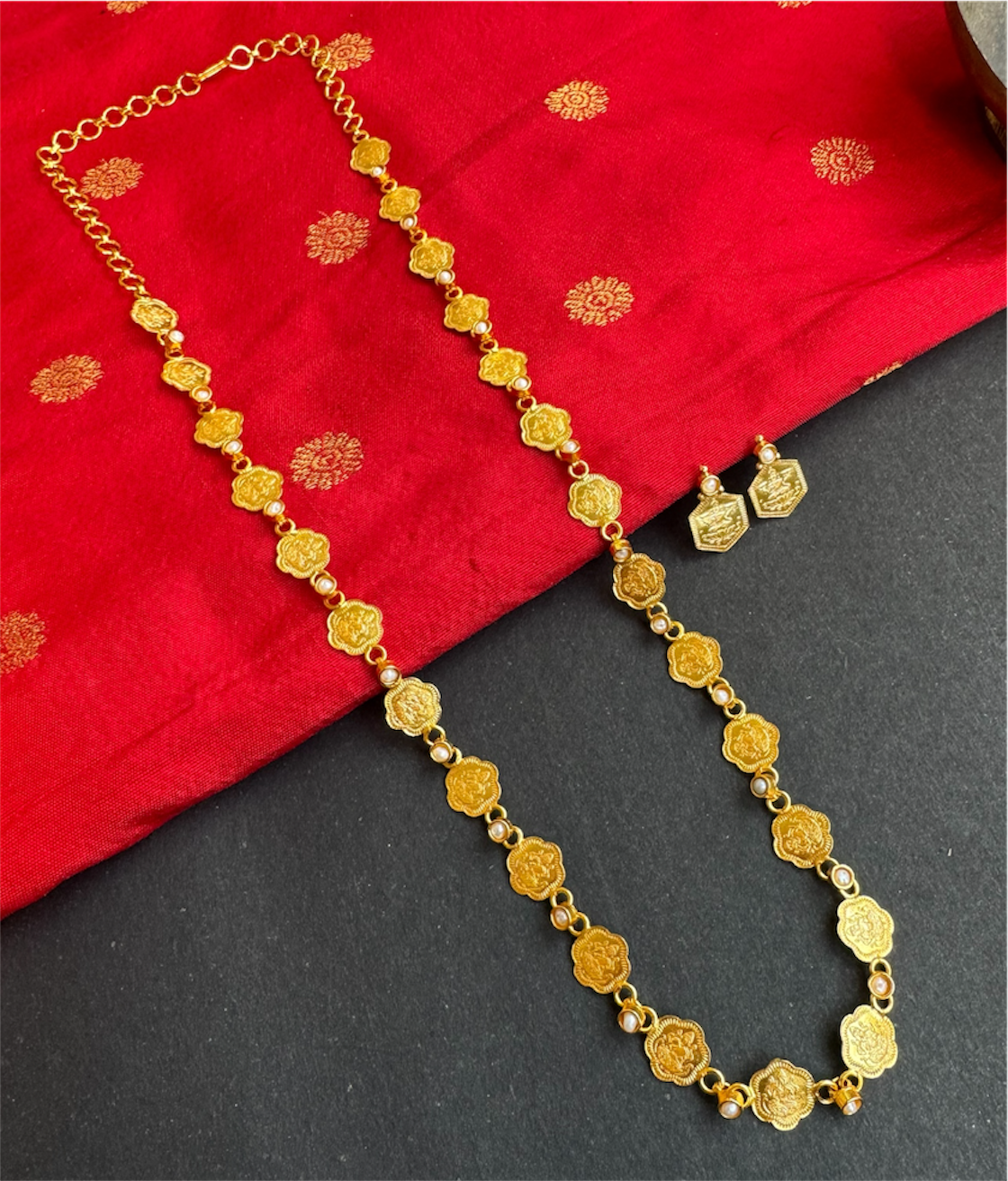 Paired with matching earrings featuring the same Lakshmi motif, this lightweight set is designed for all-day comfort. The earrings are small-sized and secured with a push-back closure, making them ideal for both everyday elegance and festive wear.