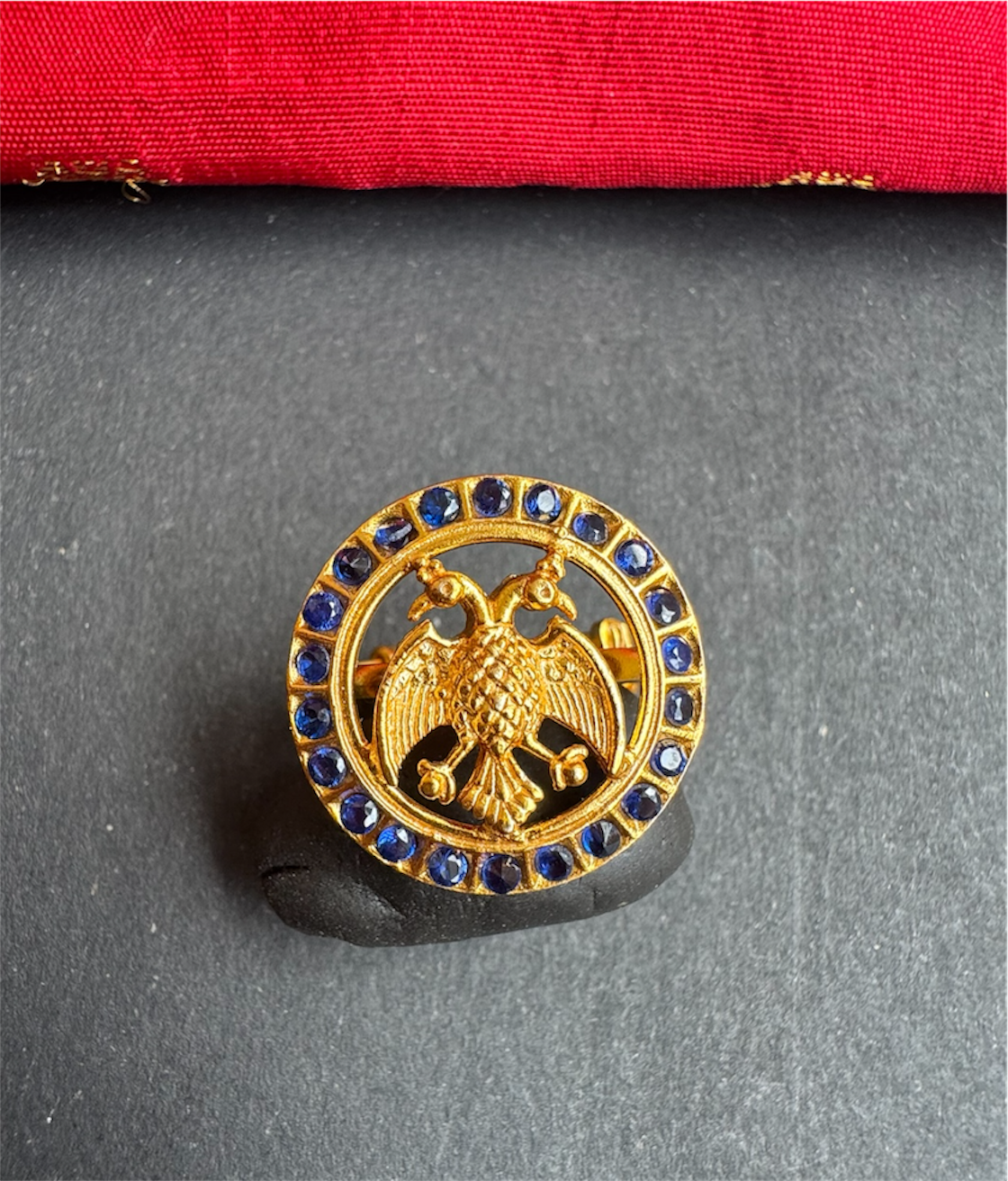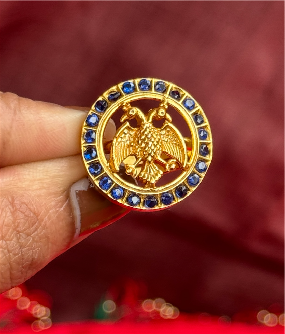 The ring features the powerful Gandaberunda—the legendary two-headed mythical bird from Hindu mythology, symbolizing immense strength, resilience, and the triumph over destructive forces. With eagle-like heads and a peacock-inspired tail, the motif embodies royal heritage and divine power.