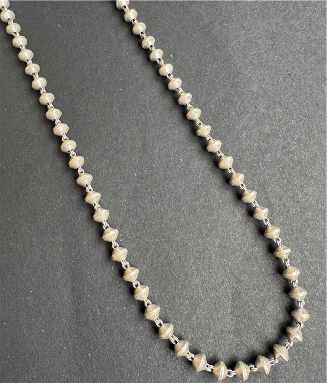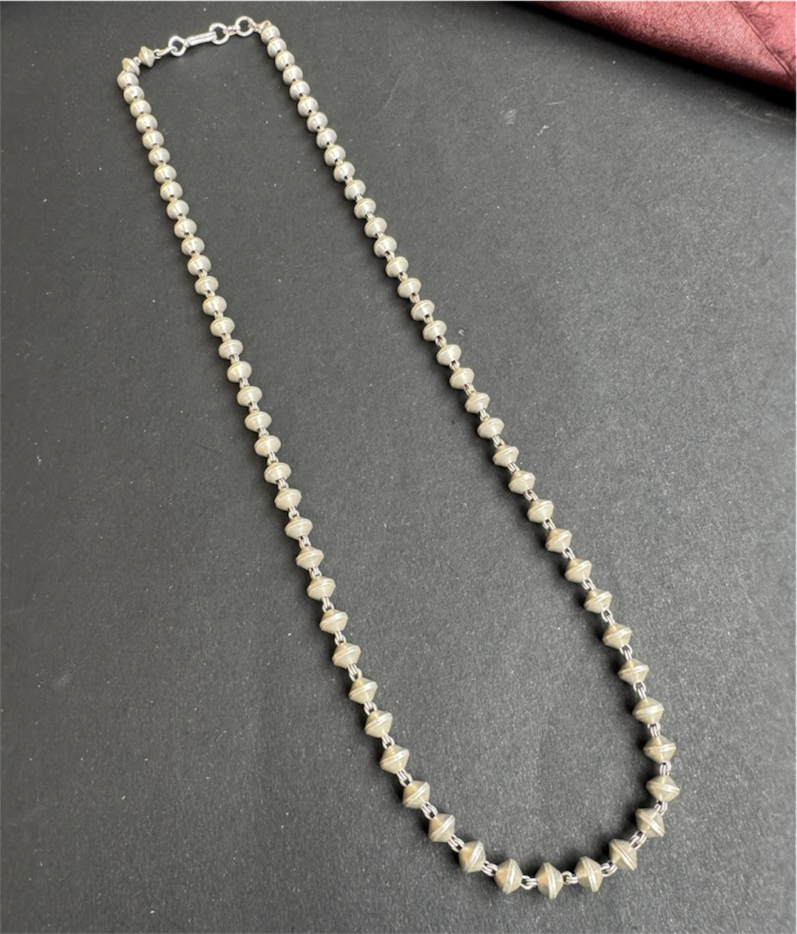 A truly unique piece, this chain features handmade 925 sterling silver beads crafted in a rare traditional design that is seldom found today. Each bead is individually hand-crafted and intricately woven with silver wire, showcasing remarkable artistry and attention to detail. In this chain each bead carries a distinctive design related to forms in nature and is carefully hand-woven with silver wire, reflecting skilled craftsmanship and cultural heritage.