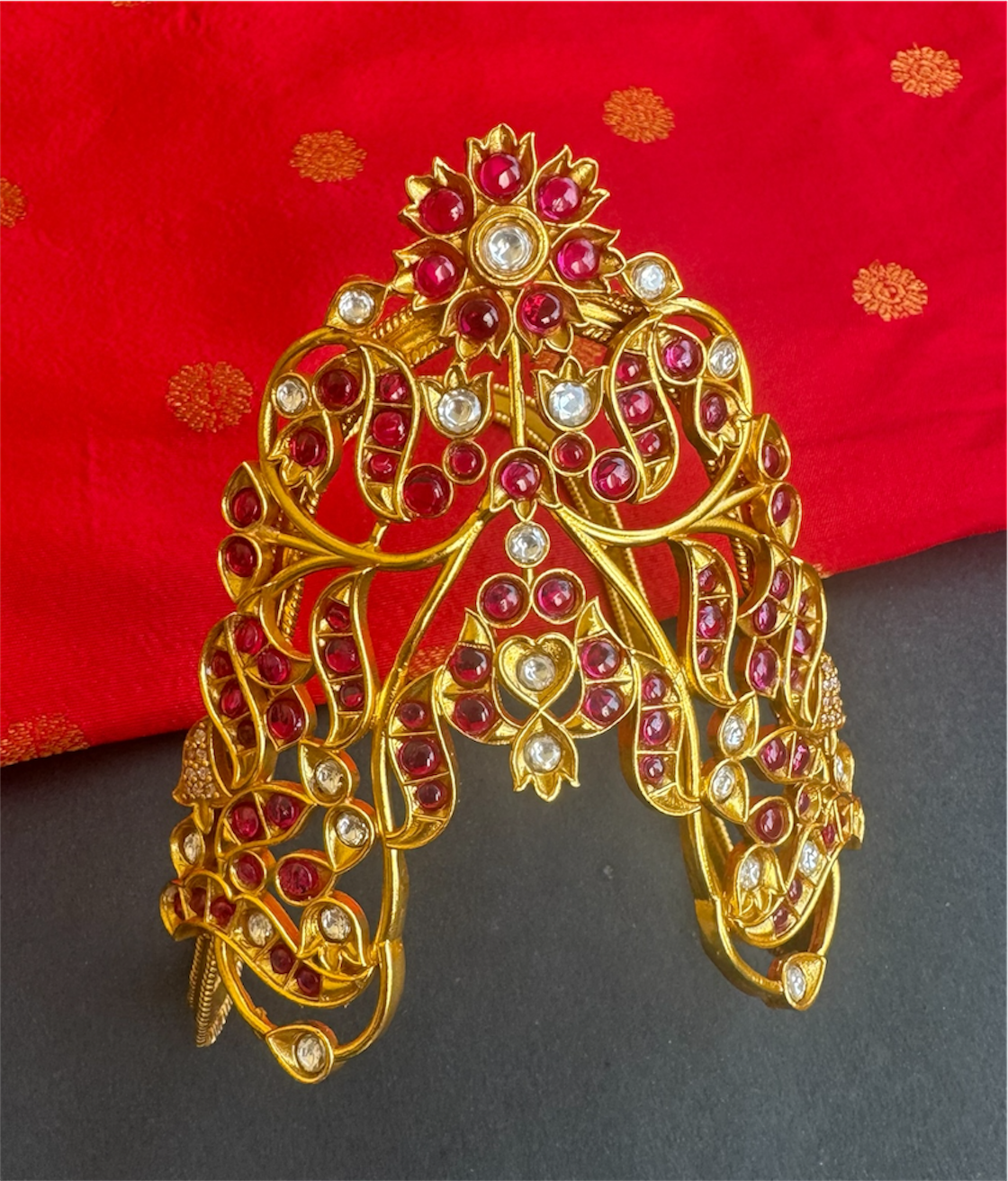 Step into the splendour of tradition with this exquisite Vanki (armband)—a timeless piece of South Indian temple jewellery crafted for the modern bride who cherishes heritage. Featuring a stunning floral motif adorned with radiant kempu stones, this heirloom piece embodies grace, strength, and cultural pride.