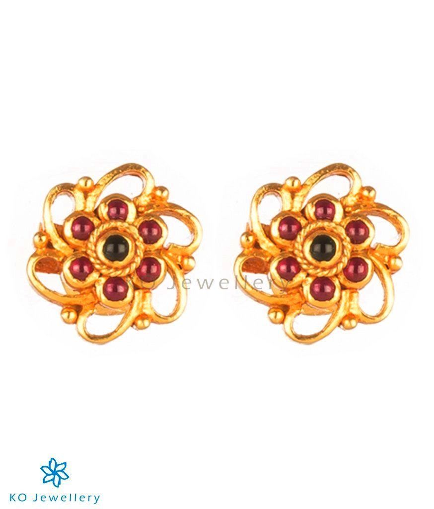 A pretty pair of floral design gold-dipped sterling silver (92.5%) ear-studs handcrafted to perfection and decorated with kempu stones.