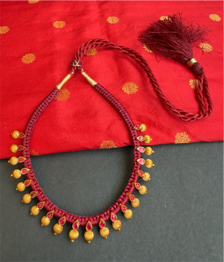 The Narayani Silver Lakshmi Thread Necklace (Maroon)