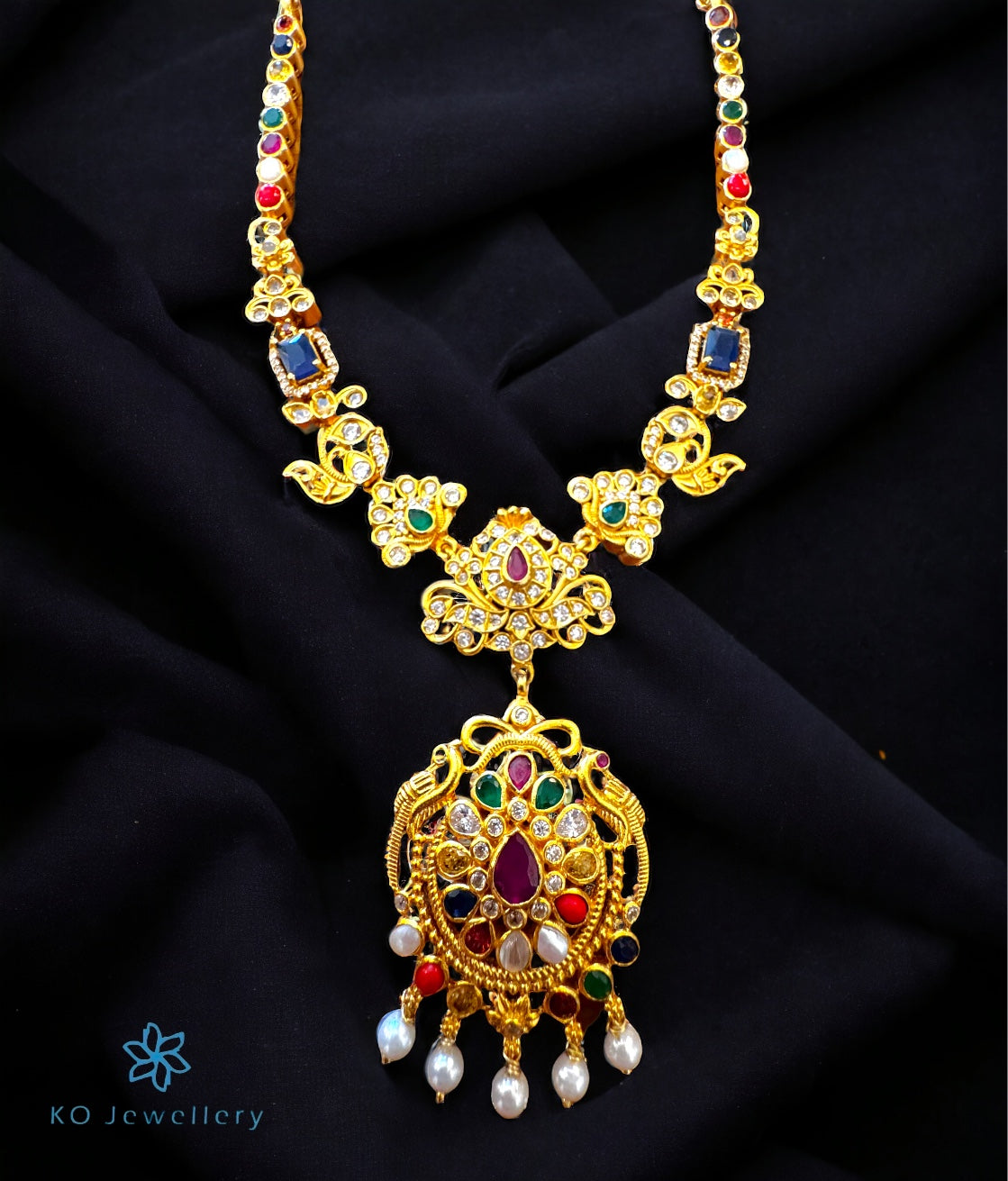 Look stunning in this lovely necklace studded with navratna gemstones .The elaborate design is combined with flawless craftsmanship to make it a stunning piece. All pieces in this collection are crafted in Sterling (92.5) Silver and gold-dipped in a special process to give them an antique look.