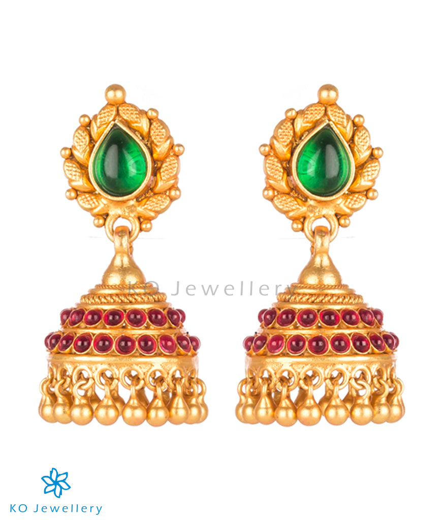 A pretty pair of silver jhumkas in green, handcrafted from Sterling Silver (92.5%) using the techniques employed for ancient South Indian gold temple jewellery. The beautiful pair features a green, drop-shaped kempu stone in the ear stud that is offset by two rows of small, red-coloured kempu stones on the dangling base of the jhumka. The pair is dipped in 24-karat gold to bring out the design and features a bombay-screw for easy wearability. Couple it with your favourite sari to make heads turn.