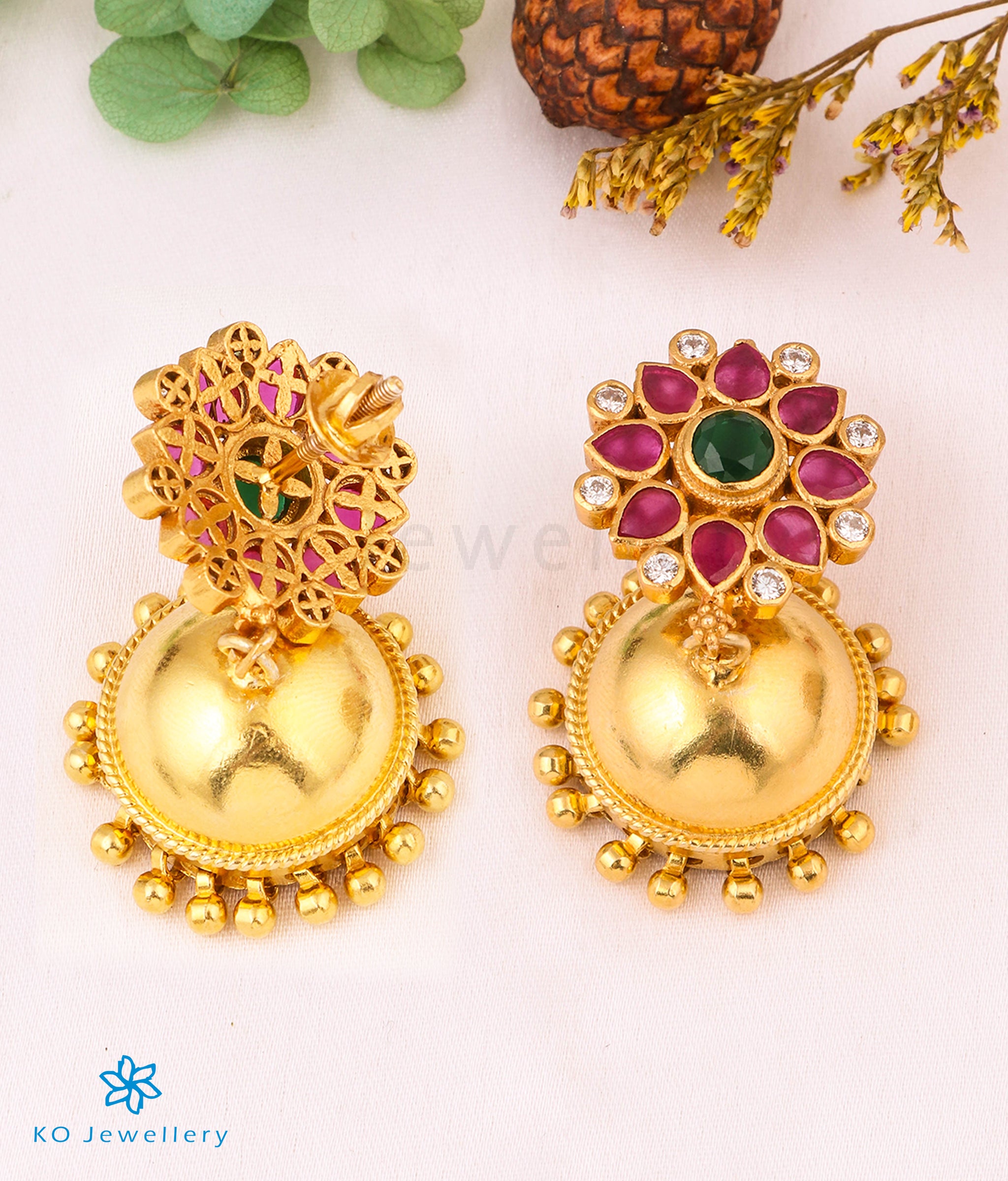 This is an exquisite pair of jhumkas that have been finely crafted using the South Indian temple gold jewellery techniques. Handcrafted from Sterling Silver (92.5%) and gold-dipped , pair it with a traditional dress to stand out from the crowd.