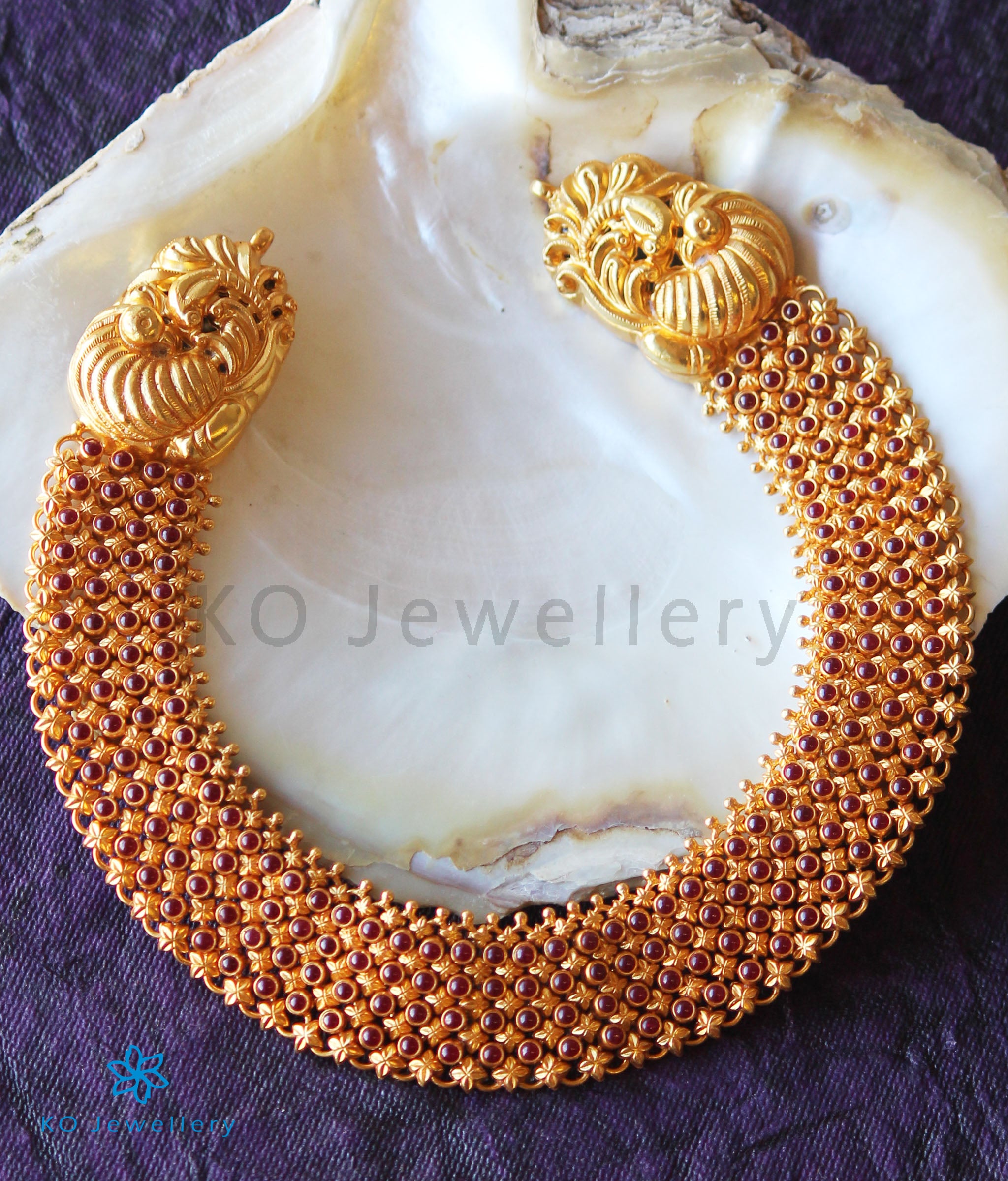 Make heads turn wherever you go with this beautiful handcrafted masterpiece in Sterling Silver (92.5). The necklace is an ornate choker that sits close to your neck and is made up of a beautiful mesh of numerous stamped silver units (decorated with kempu stones) all joined together with great skill and finesse.Two plumed peacocks brought to life with nakkasi work hold the necklace in place.