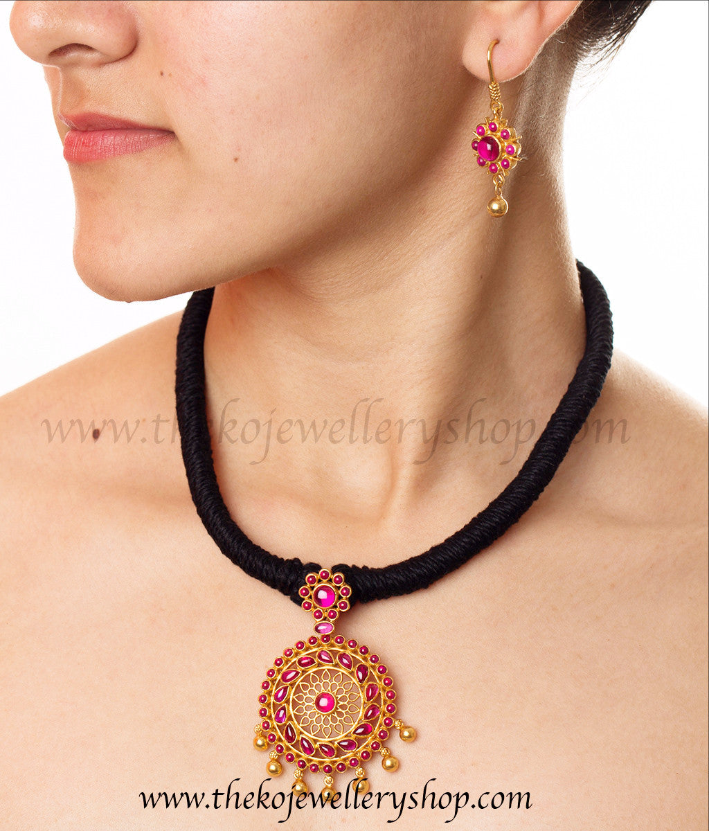 Make a fashion statement with this handcrafted rope necklace in which an ornate kempu stone pendant in Sterling Silver (92.5%) has been woven into black cotton thread. The pendant is crafted using techniques used in ancient South Indian antique gold temple jewellery .The necklace comes with a pair of matching ear-drops.