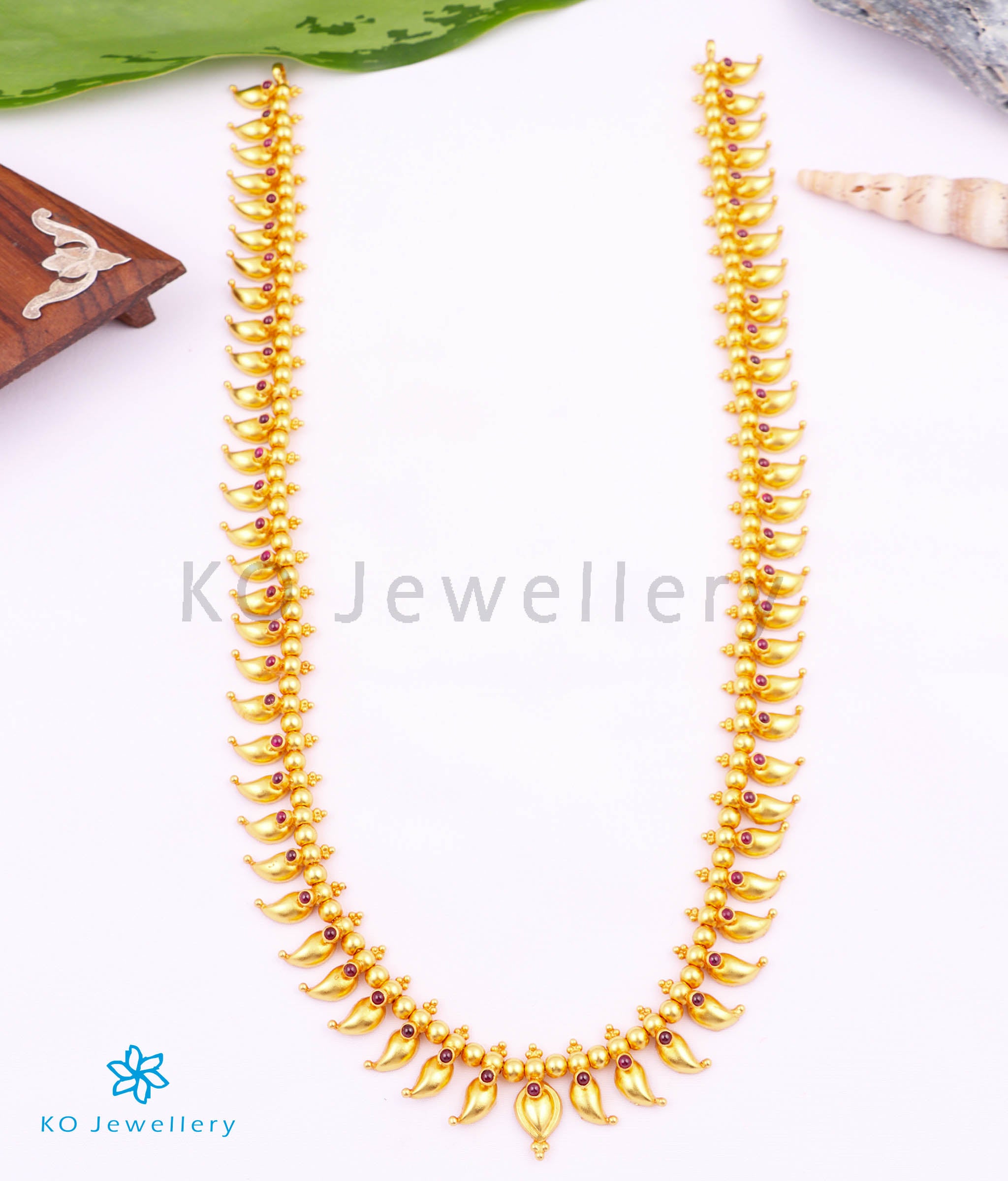 Discover the beauty of real temple jewellery with this bright, long necklace inspired by the timeless paisley or Mango motif. Each piece is handcrafted in pure 92.5 Sterling Silver, using age-old jewellery-making techniques preserved in our atelier. The necklace is finished with a luxurious 24K gold plating that delivers an authentic real-gold look, while delicate kempu stones add a touch of traditional brilliance.