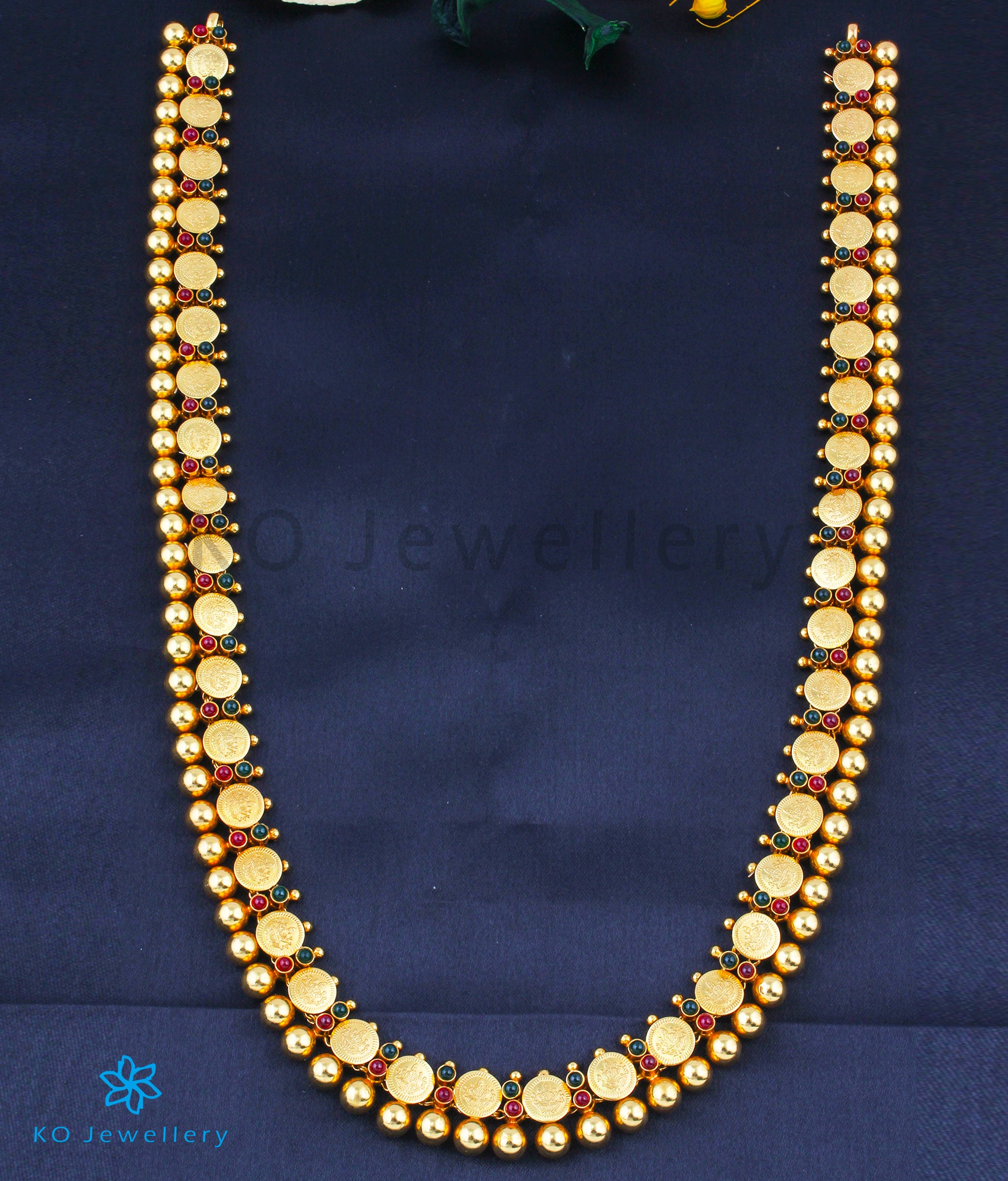This is a traditional Indian `kasu-mala' or coin necklace, depicting Laxmi the goddess of wealth. Crafted in pure silver and dipped in 24-carat gold this is a lengthy necklace and looks best when worn on a Sari. Part of the Temple Jewellery collection of KO it is crafted using techniques used in ancient South Indian antique jewellery. All pieces in this collection are crafted in Sterling (92.5 %) Silver and gold-dipped in a special process to give them an antique look.