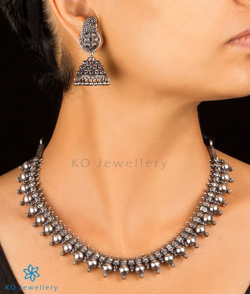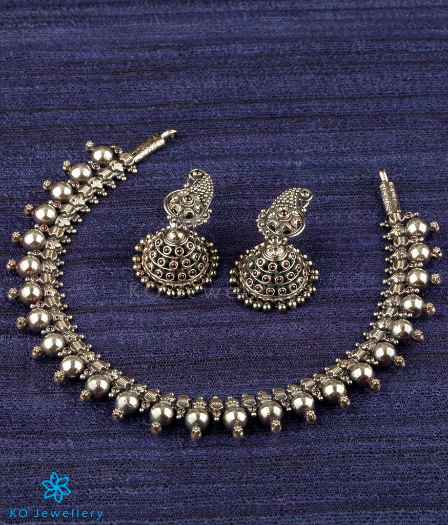 A petite Sterling Silver (92.5) necklace with silver balls decorated with tiny handcrafted accents and `kempu stones' . The skill and craftsmanship exhibited in this piece are truly amazing.It comes with a pair of matching jhumkas with the peacock ear-stud.
