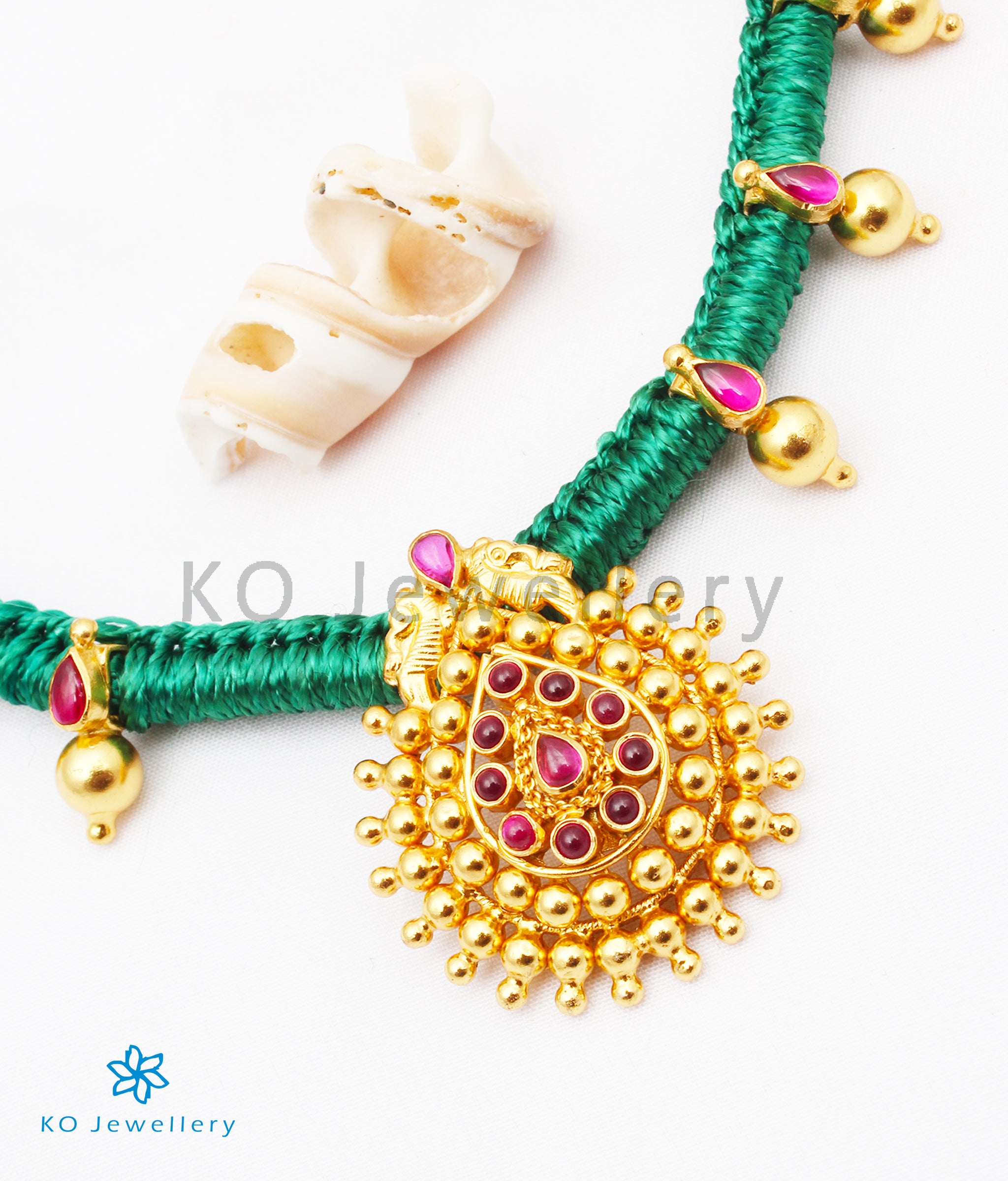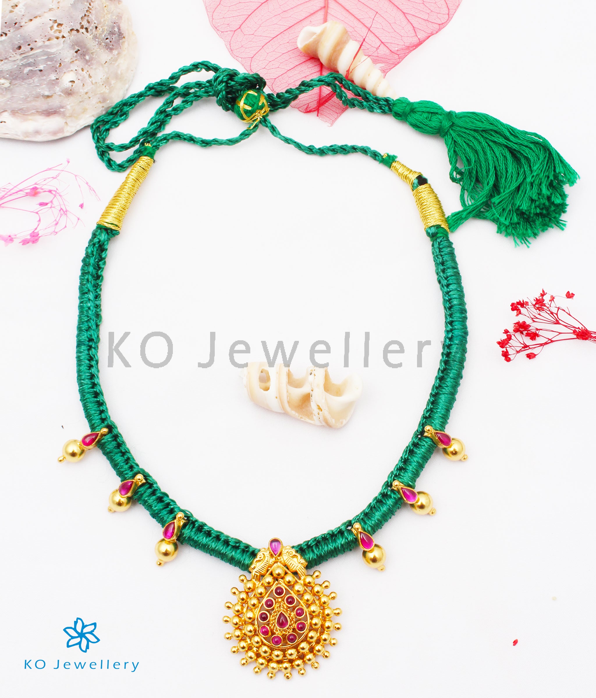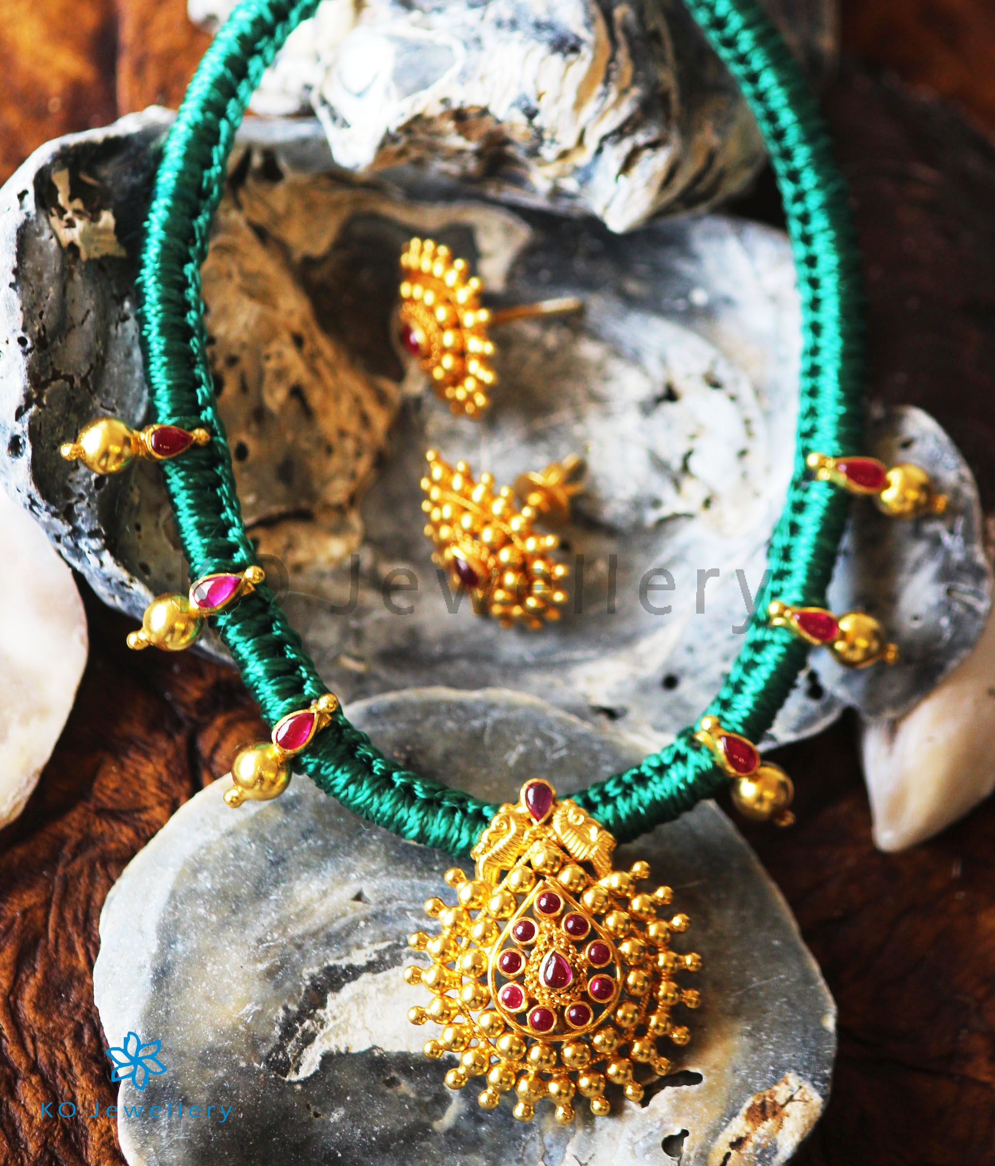 This stunning vintage necklace creates a mesmerising effect with its perfect symmetry and flawless craftsmanship. The tear-drop shape pendant at the center stands out with its attractive design highlighted with kempu stones. The gorgeous gold-dipped pendant and silver balls are crafted in sterling silver (92.5%) and woven into green cotton thread.It is paired with matching tear-drop shaped earstuds.