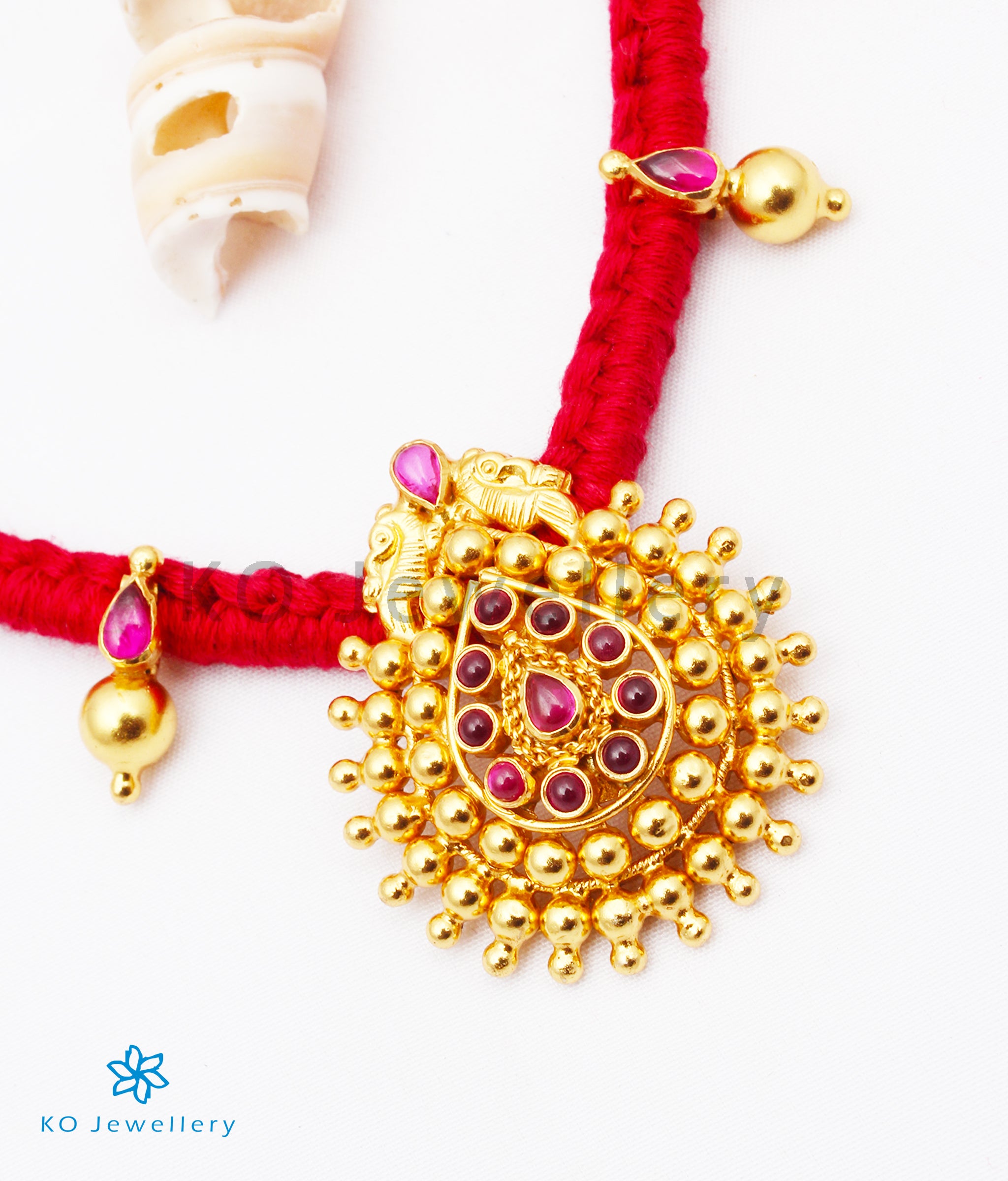 This stunning vintage necklace creates a mesmerising effect with its perfect symmetry and flawless craftsmanship. The tear-drop shape pendant at the center stands out with its attractive design highlighted with kempu stones. The gorgeous gold-dipped pendant and silver balls are crafted in sterling silver (92.5%) and woven into red cotton thread.It is paired with matching tear-drop shaped earstuds.