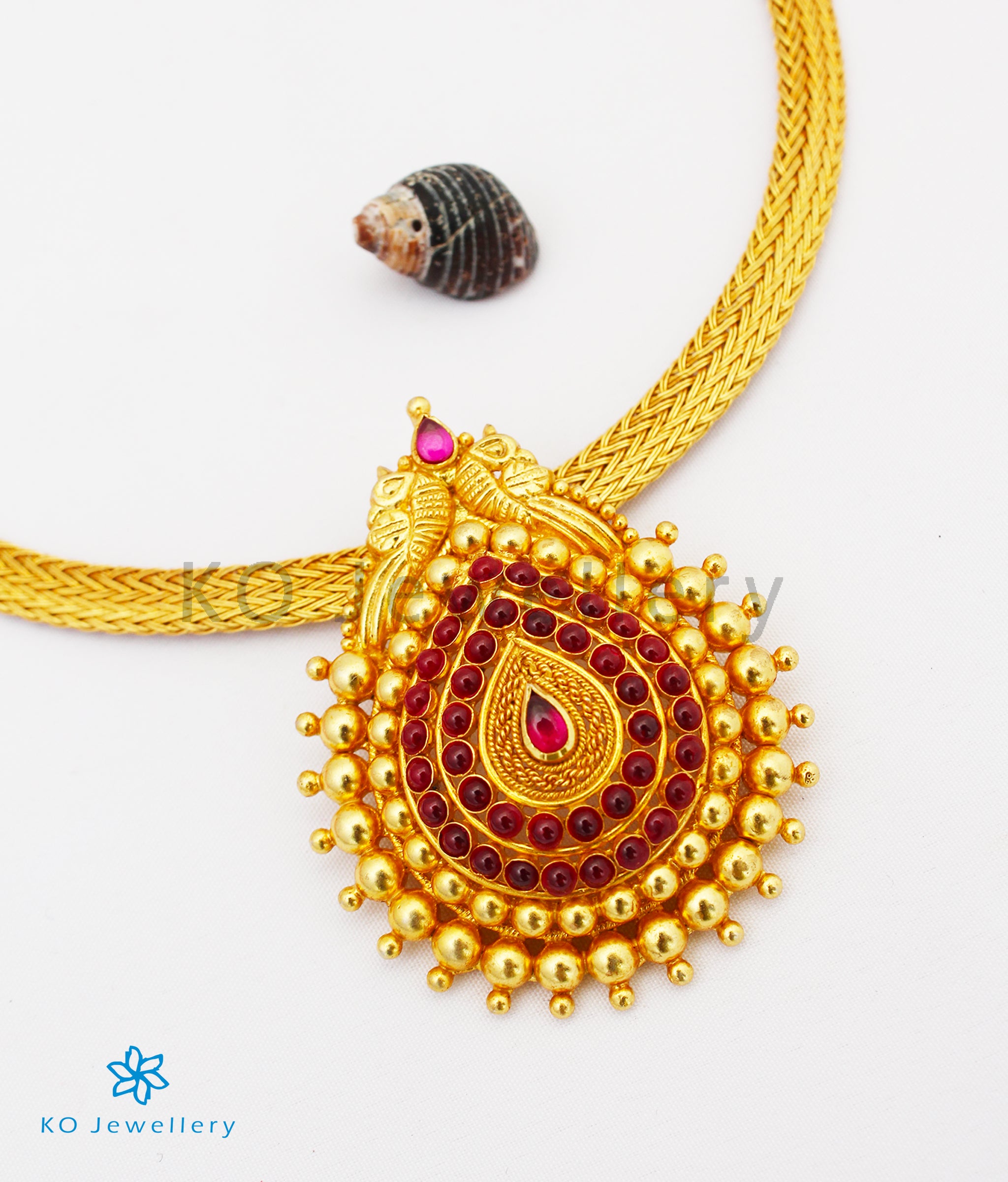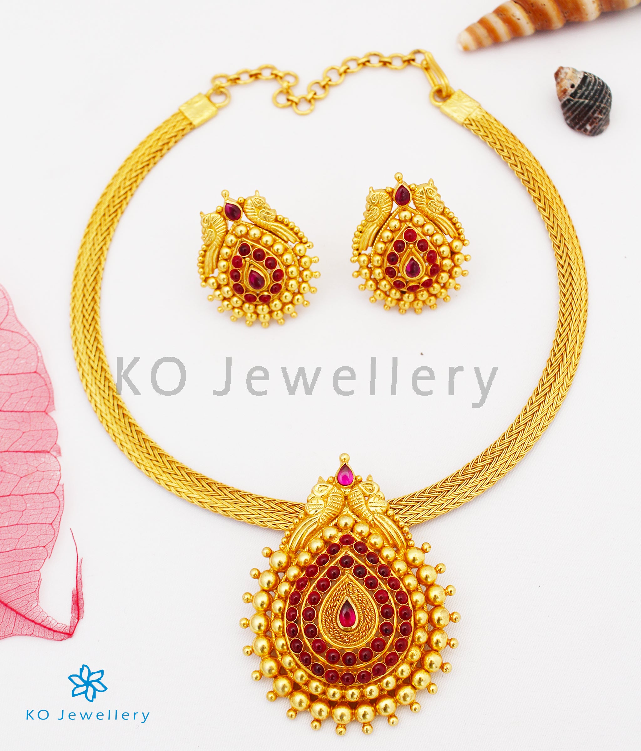 Dress up in this gorgeous necklace with a pendant that has intricately carved peacocks and beautiful kempu stones set in a tear drop shape . The necklace string is made of a flat Sterling Silver (92.5%) chain that is gold-dipped. Similarly designed earstuds further accentuate the look. Handcrafted from Sterling Silver (92.5%), the set is dipped in 24 karat gold to bring out the design.