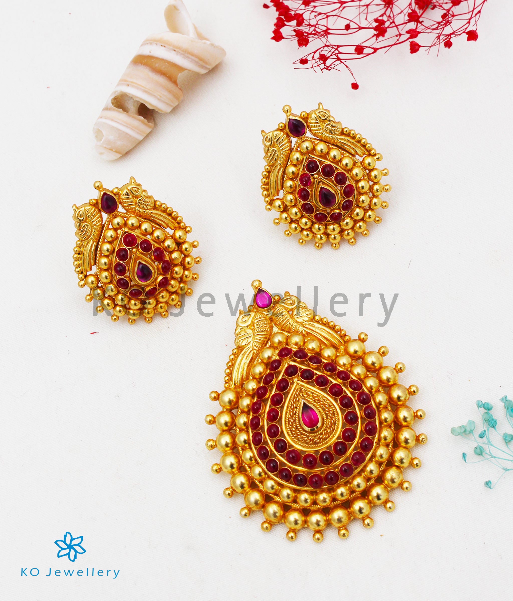 Dress up in this gorgeous pendant with intricately carved peacocks and beautiful kempu stones set in a tear drop shaped pendant and earstuds . Similarly designed earstuds further accentuate the look. Handcrafted from Sterling Silver (92.5%), the set is dipped in 24 karat gold to bring out the design.