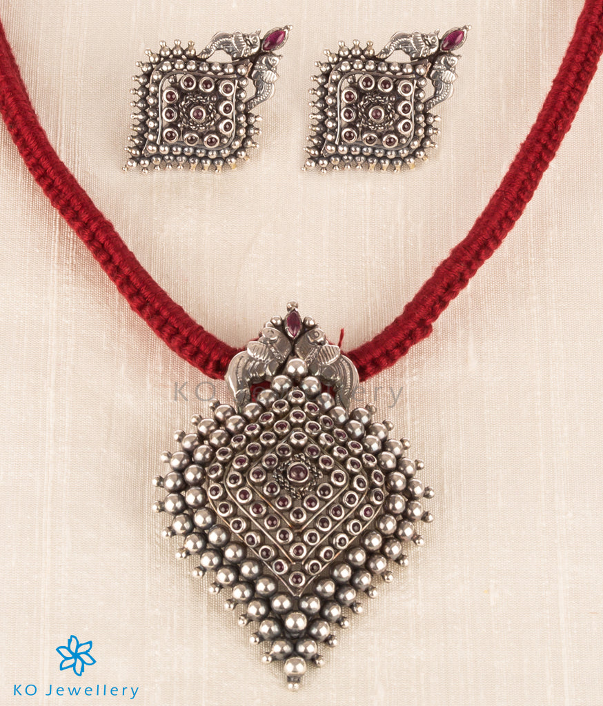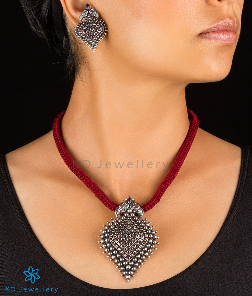 An ornate and intricate neckpiece this is a versatile piece that can be paired with ethnic attire or sarees. It has an intricate pendant topped with twin peacocks and studded with kempu stones which is mounted on a handwoven maroon colour cotton thread.The ear-studs are also crafted in the same design.This piece is crafted in Sterling Silver (92.5%) using techniques used in ancient South Indian antique gold temple jewellery. The pendant is detachable and can be worn on a silver chain too and the ear-studs come with a bombay screw.