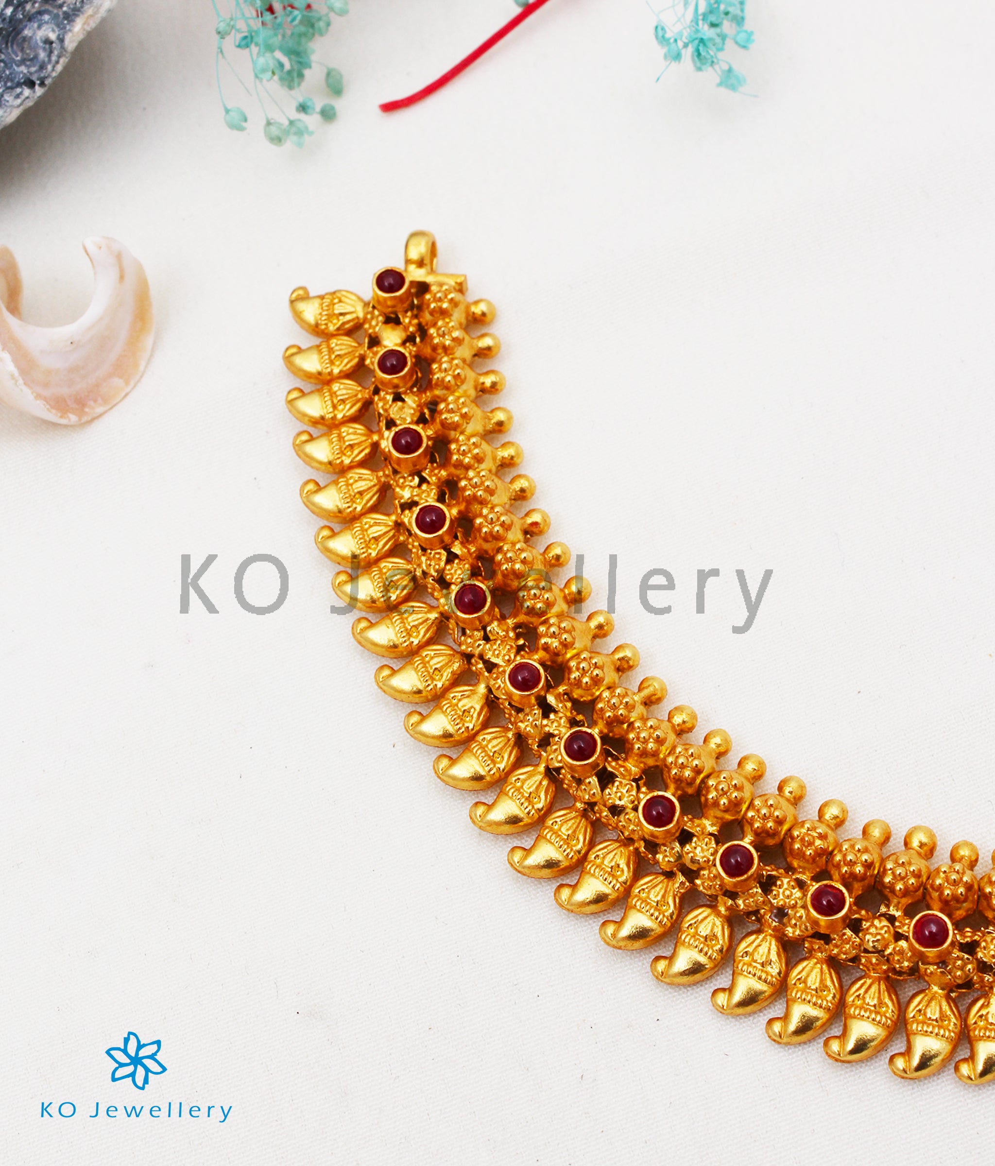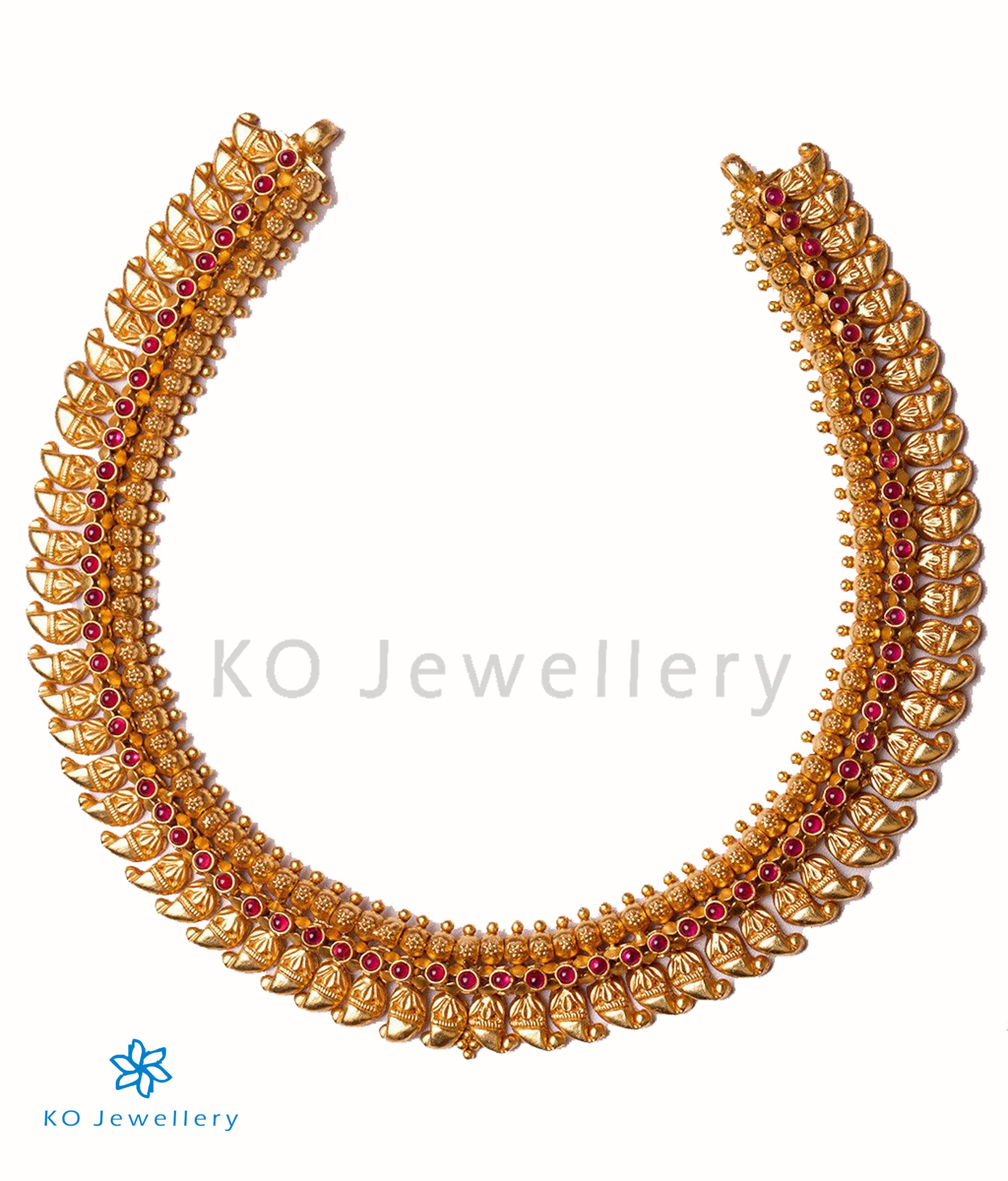 A petite and pretty Sterling Silver (92.5%) necklace in the very popular paisley or mango motif decorated with kempu stones.Crafted using techniques used in ancient South Indian antique gold temple jewellery the entire piece is crafted in pure Sterling Silver (92.5%) and dipped in 24 karat gold.