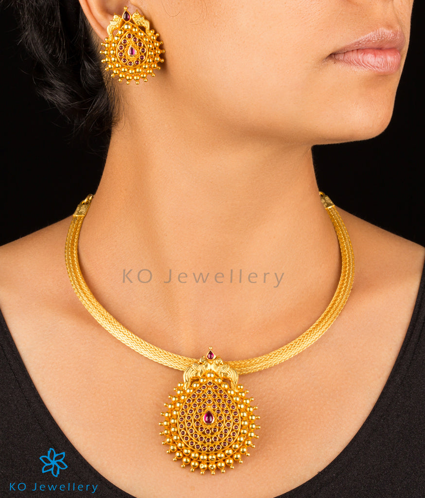 A lightweight and attractive pendant/earrings this is a versatile piece that can be paired with ethnic attire or sarees. It has a intricate tear-drop shaped pendant topped with twin peacocks and studded with kempu stones attached to a flat silver chain and comes with a pair of matching ear-studs.This entire piece is crafted in Sterling Silver (92.5%) using techniques used in ancient South Indian antique gold temple jewellery.