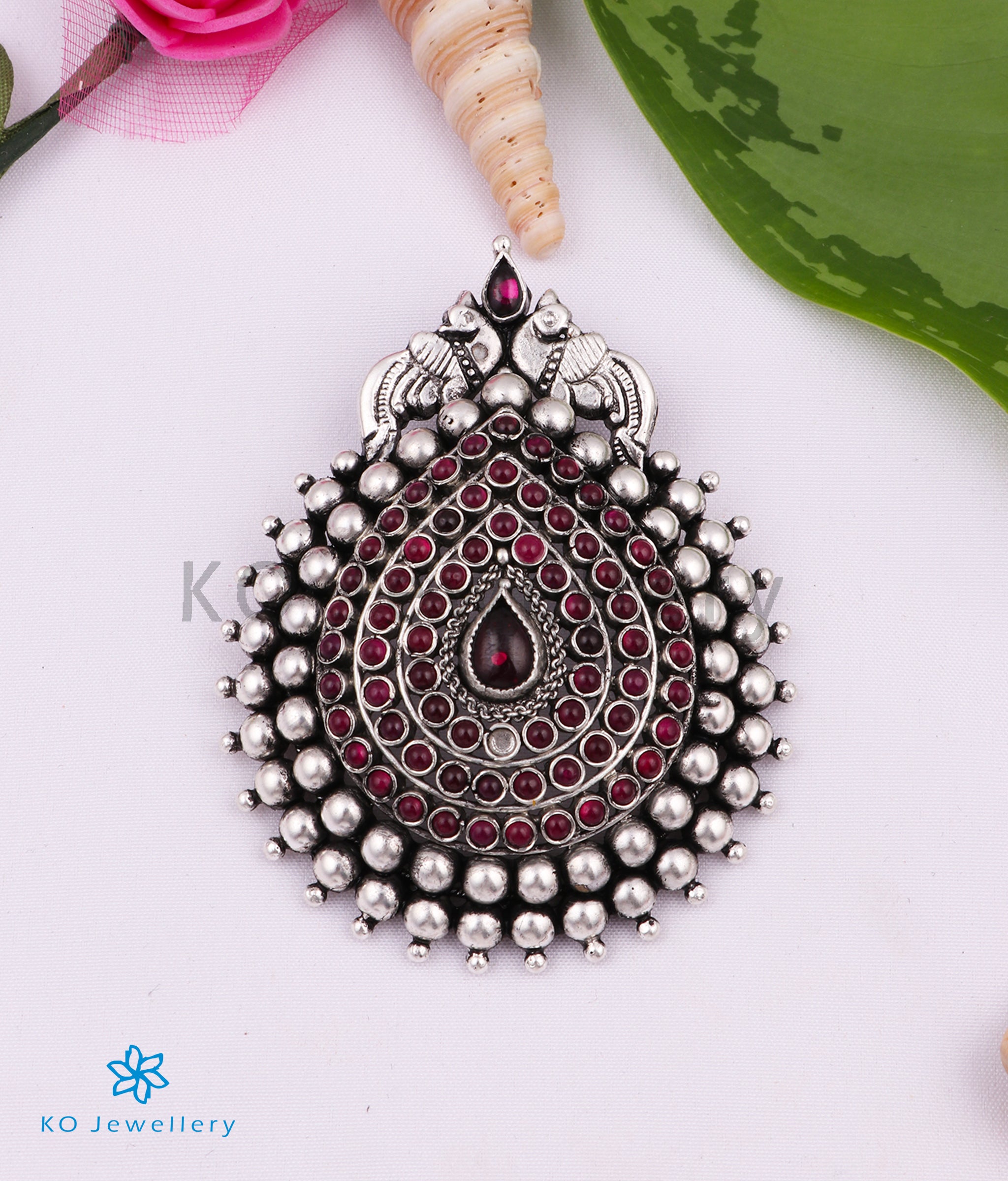A lightweight and attractive pendant/earrings set this is a versatile piece that can be paired with ethnic attire or sarees. It has a intricate tear-drop shaped pendant with kempu stones attached to a flat silver chain and comes with a pair of matching ear-studs.This entire set is crafted in Sterling Silver (92.5%) using techniques used in ancient South Indian antique gold temple jewellery and oxidised to give it a dark patina.