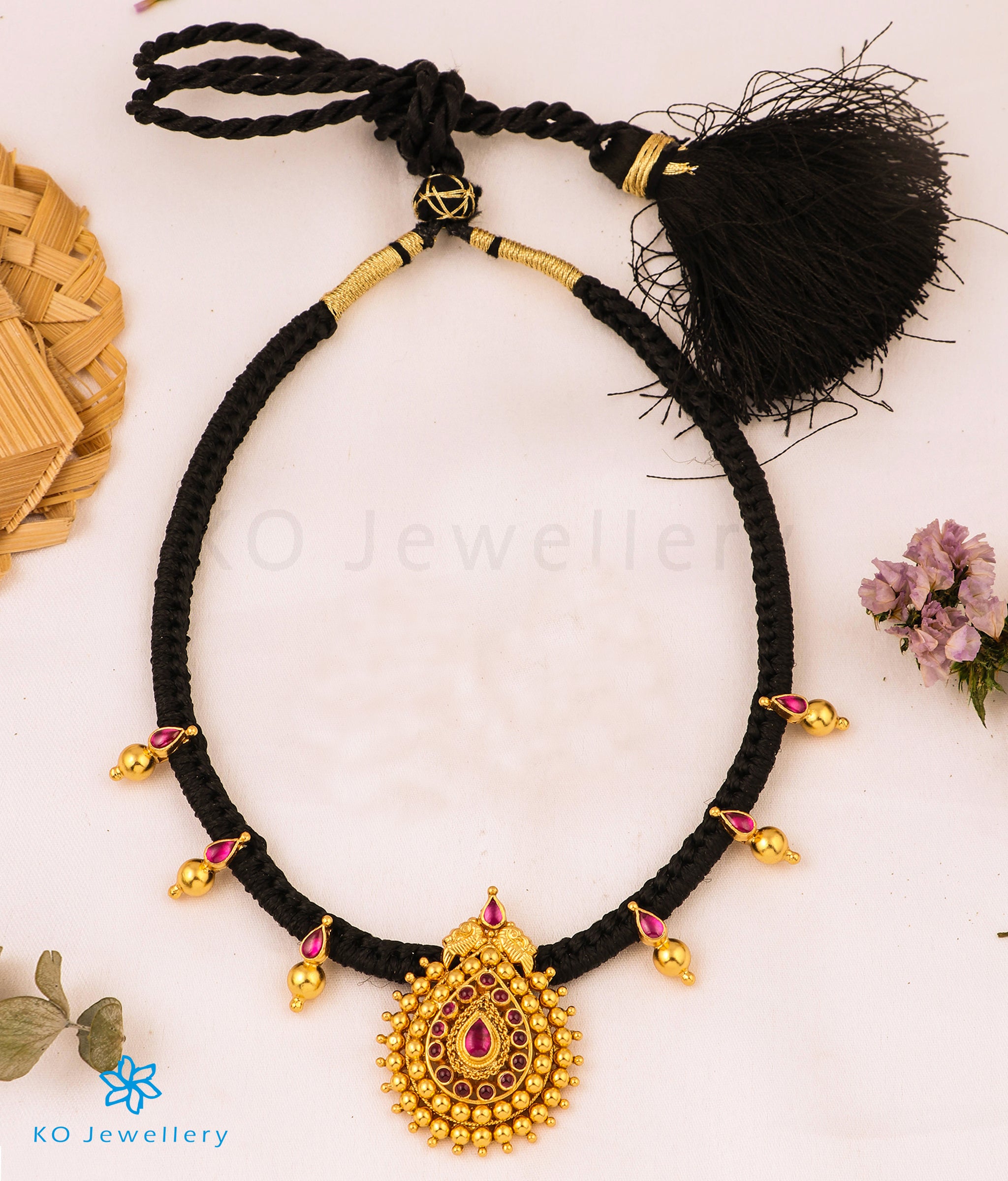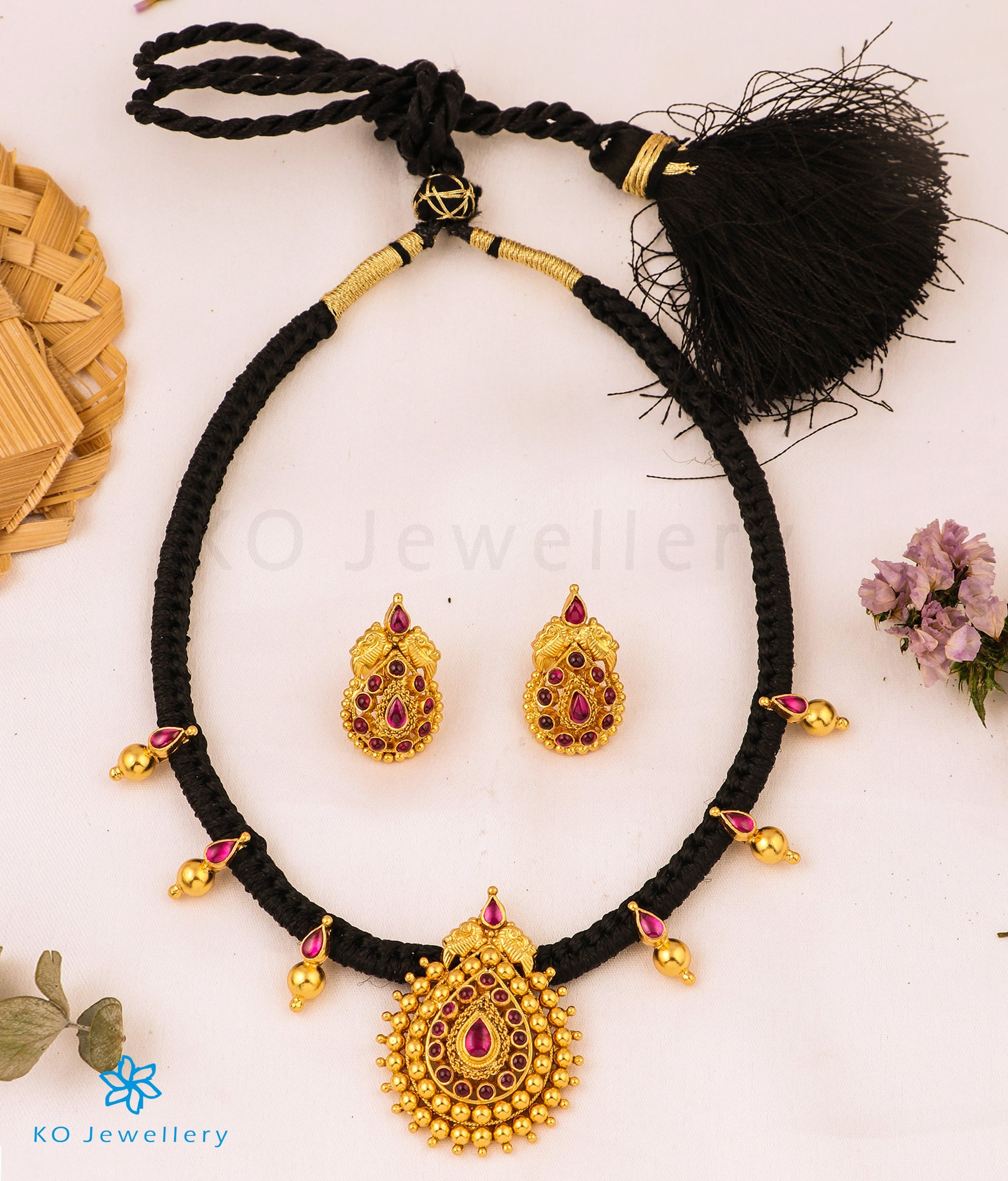 This stunning vintage necklace creates a mesmerising effect with its perfect symmetry and flawless craftsmanship. The tear-drop shape pendant at the center stands out with its attractive design highlighted with kempu stones. The gorgeous gold-dipped pendant and silver balls are crafted in sterling silver (92.5%) and woven into black cotton thread.It is paired with matching tear-drop shaped earstuds.