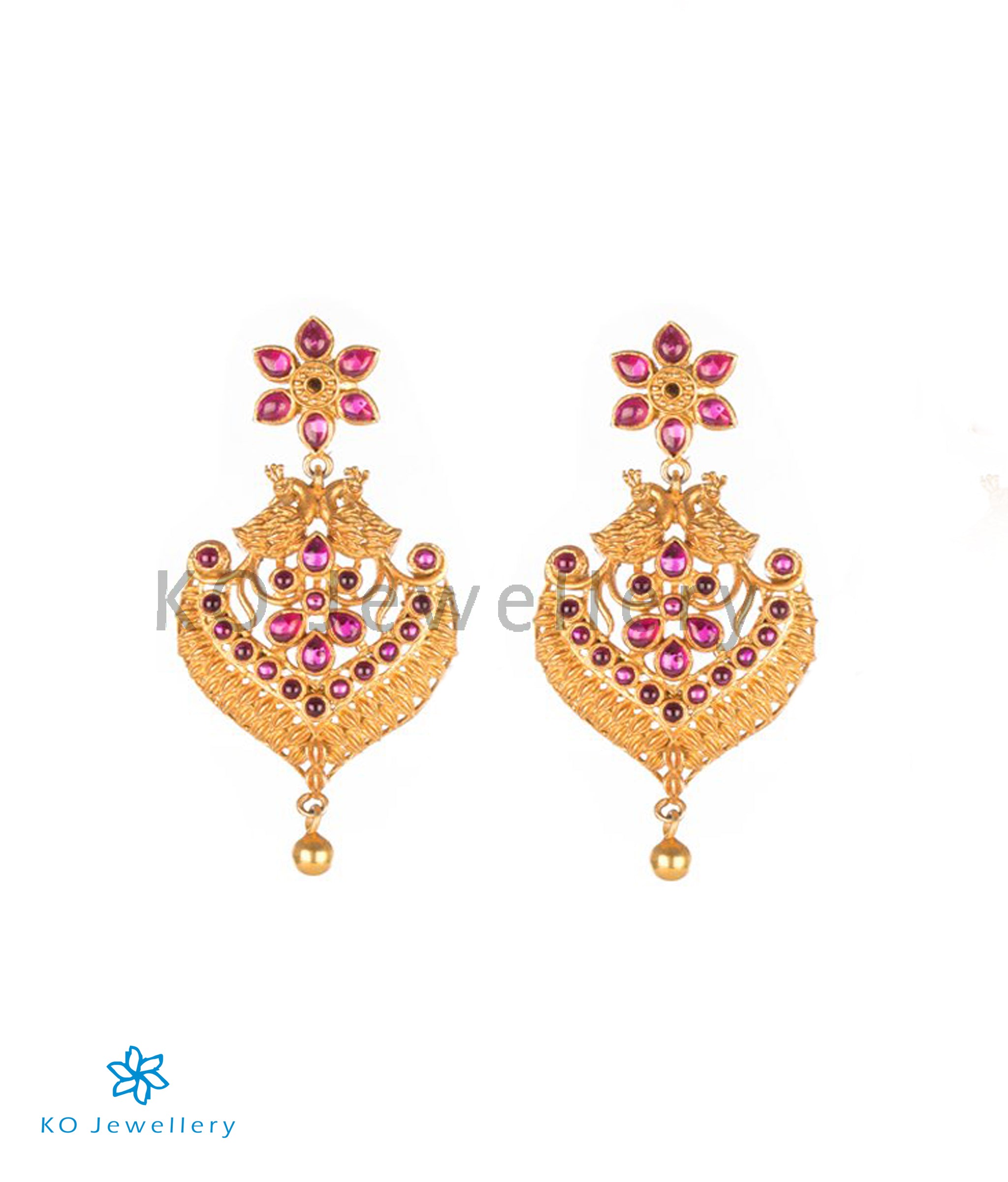 This is an exquisite pair of earrings that have been finely crafted using the South Indian temple gold jewellery techniques. Two peacocks adorn an intricate golden frame that encloses a design of blooming flowers and leaves. Tastefully used green kempu stones further accentuate the design handcrafted from Sterling Silver (92.5%). Pair it with a traditional dress to stand out from the crowd.