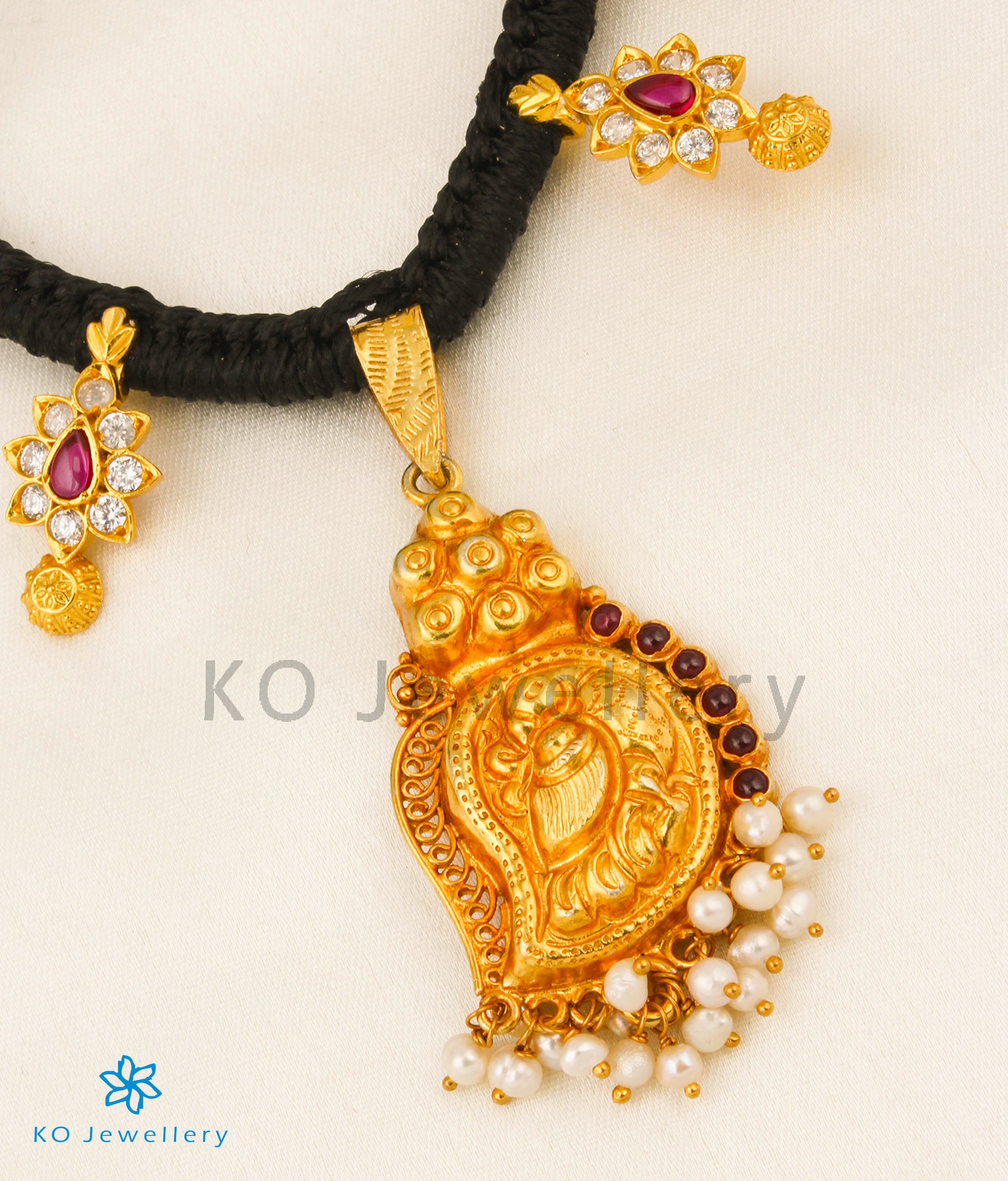 Add a pretty note to your festive wardrobe with this handcrafted kemp necklace in which various sterling silver (92.5%) pendants in pretty shapes in black colour thread. Crafted using techniques used in ancient South Indian antique jewellery this exquisite necklace is studded with `kempu' (red) stones.