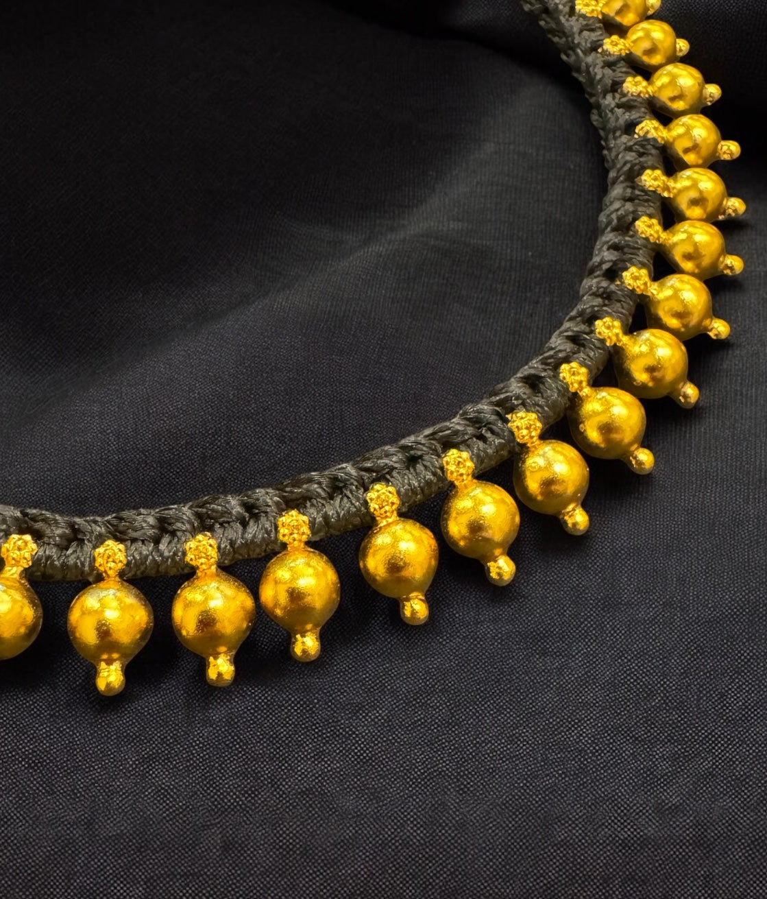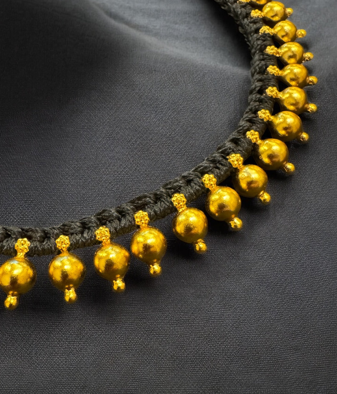 Gold-dipped round beads of sterling silver(92.5%) are handwoven into black cotton thread to create this lovely ethnic necklace. The necklace is in a choker design. Crafted using techniques used in ancient South Indian antique gold temple jewellery the entire piece is crafted in pure silver and gold-dipped. Pair it with one of our antique-looking jhumkas and you are all set to dazzle...