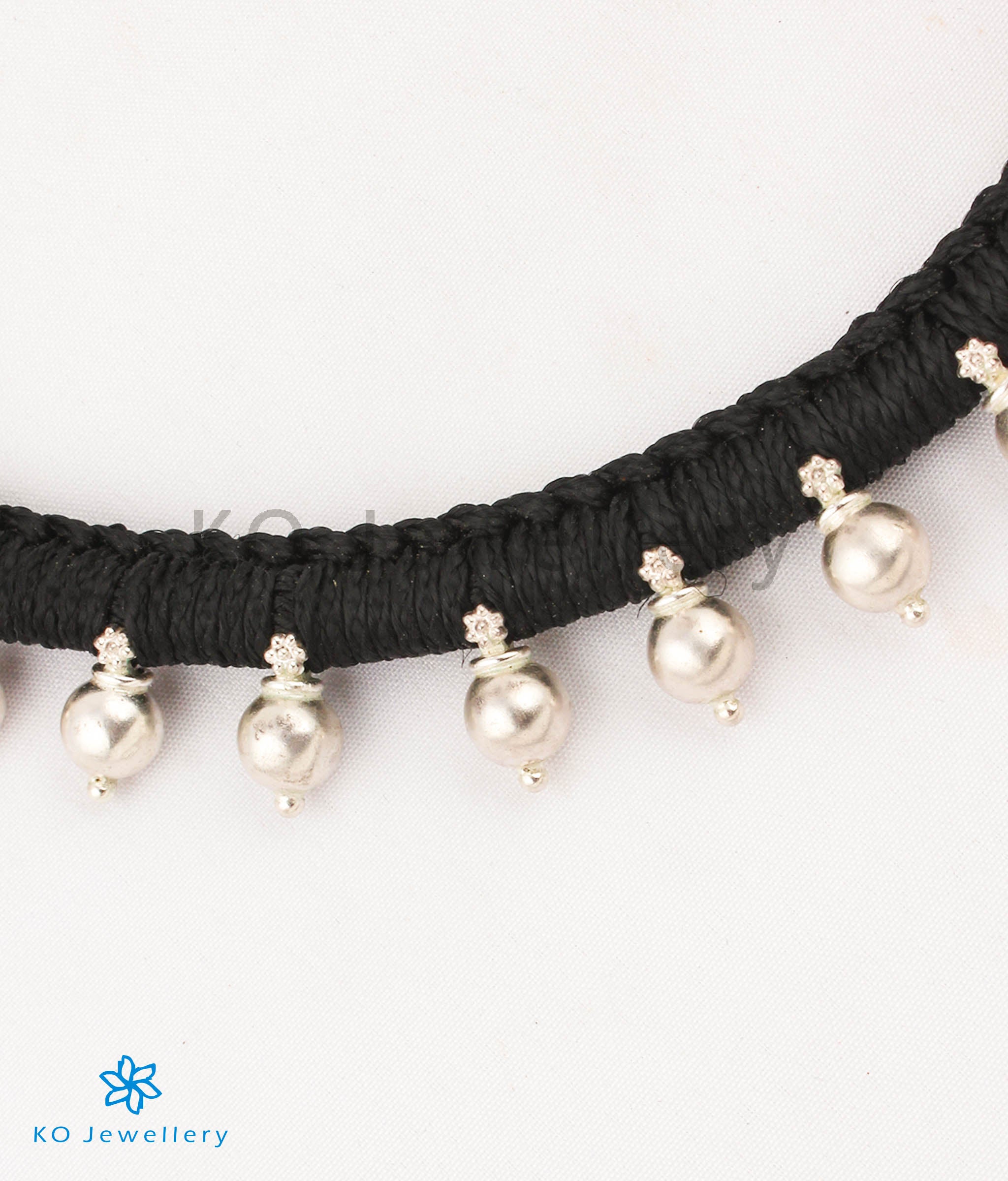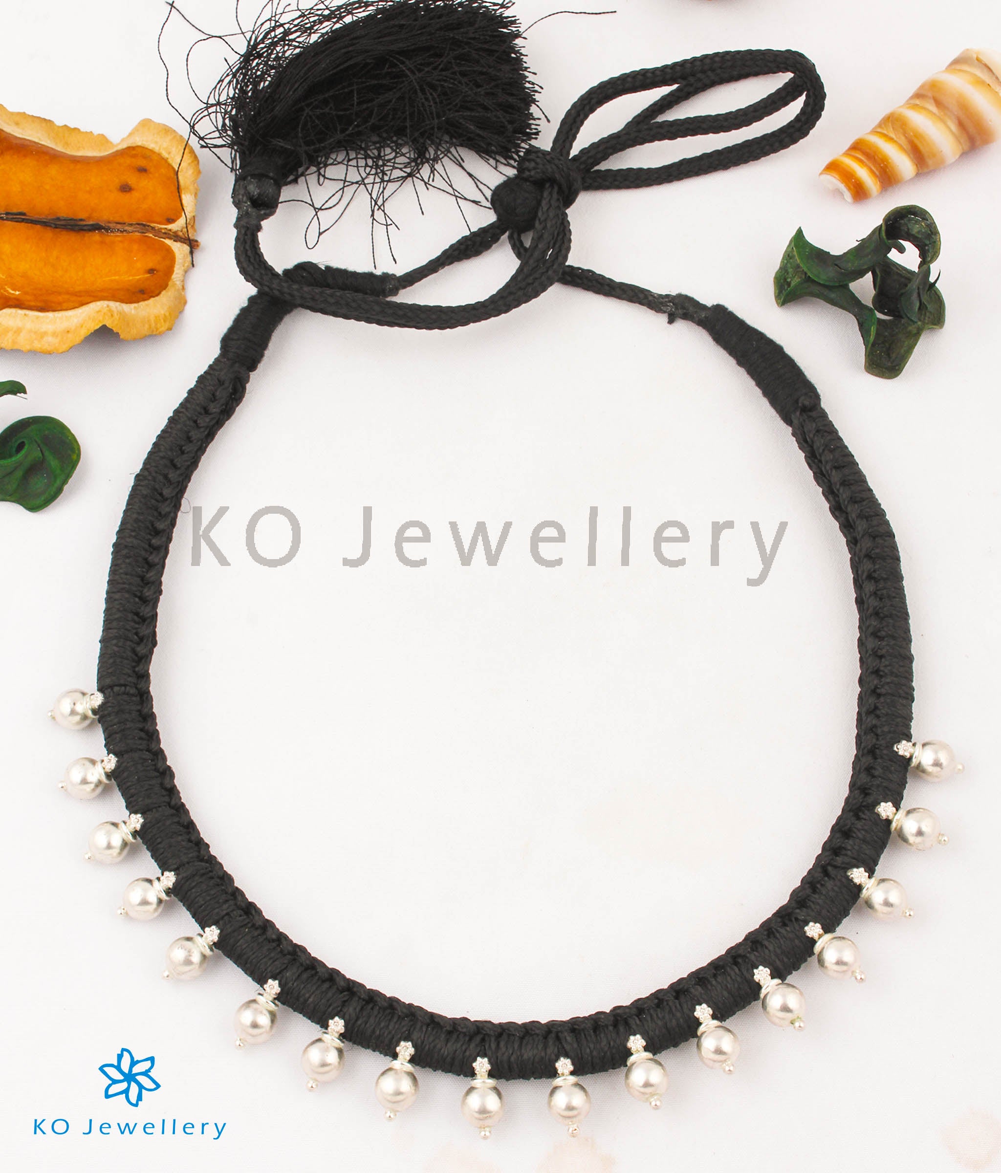 Round beads of sterling silver(92.5%) are handwoven into black cotton thread to create this lovely ethnic necklace. The necklace is in a choker design. Crafted using techniques used in ancient South Indian antique gold temple jewellery the entire piece is crafted in pure silver and gold-dipped. Pair it with one of our antique-looking jhumkas and you are all set to dazzle...