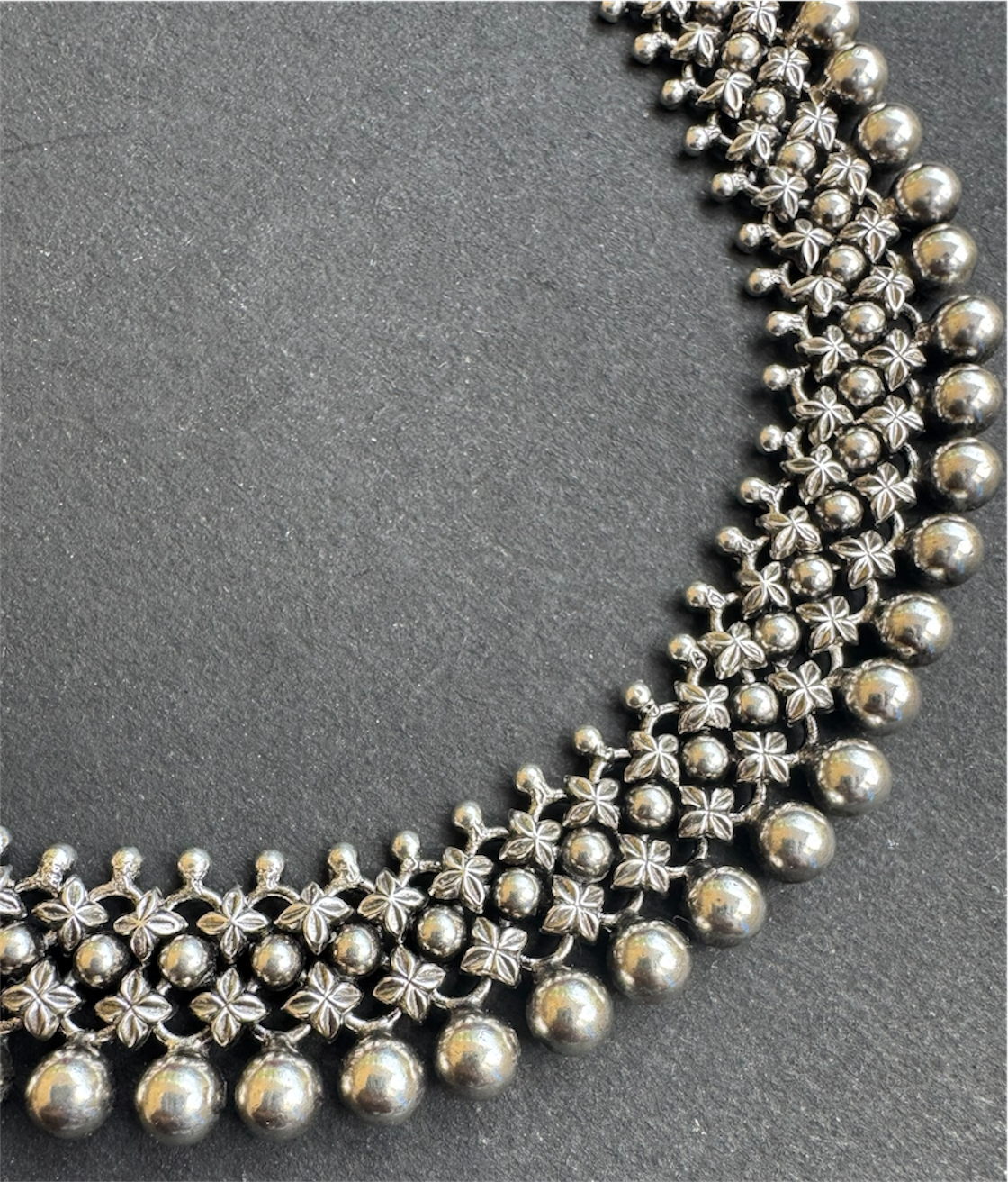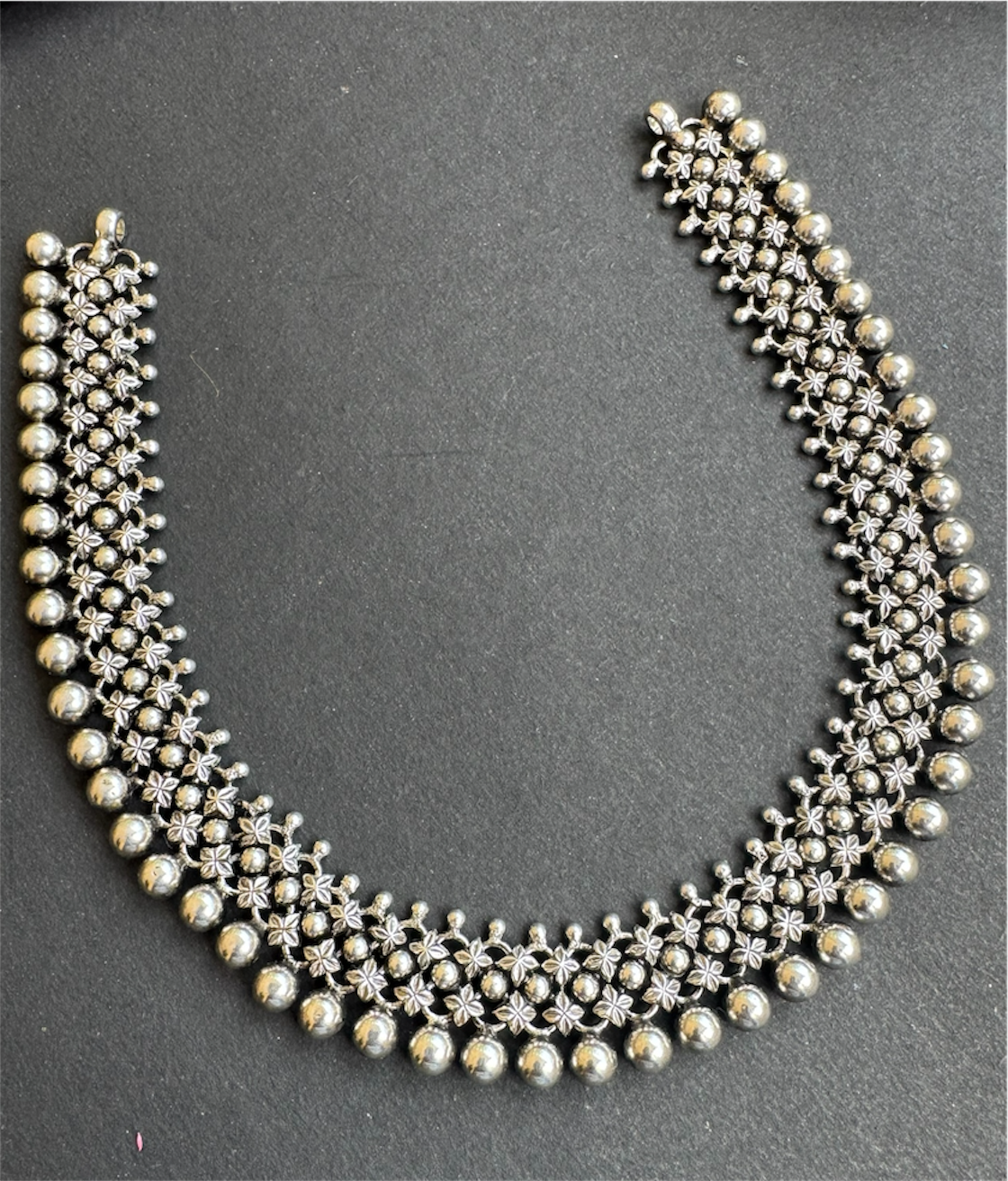 An exquisite design handcrafted in Sterling Silver (92.5). The necklace is an ornate choker that sits close to your neck and is made up of a beautiful mesh of numerous stamped silver units all joined together with great skill and finesse.