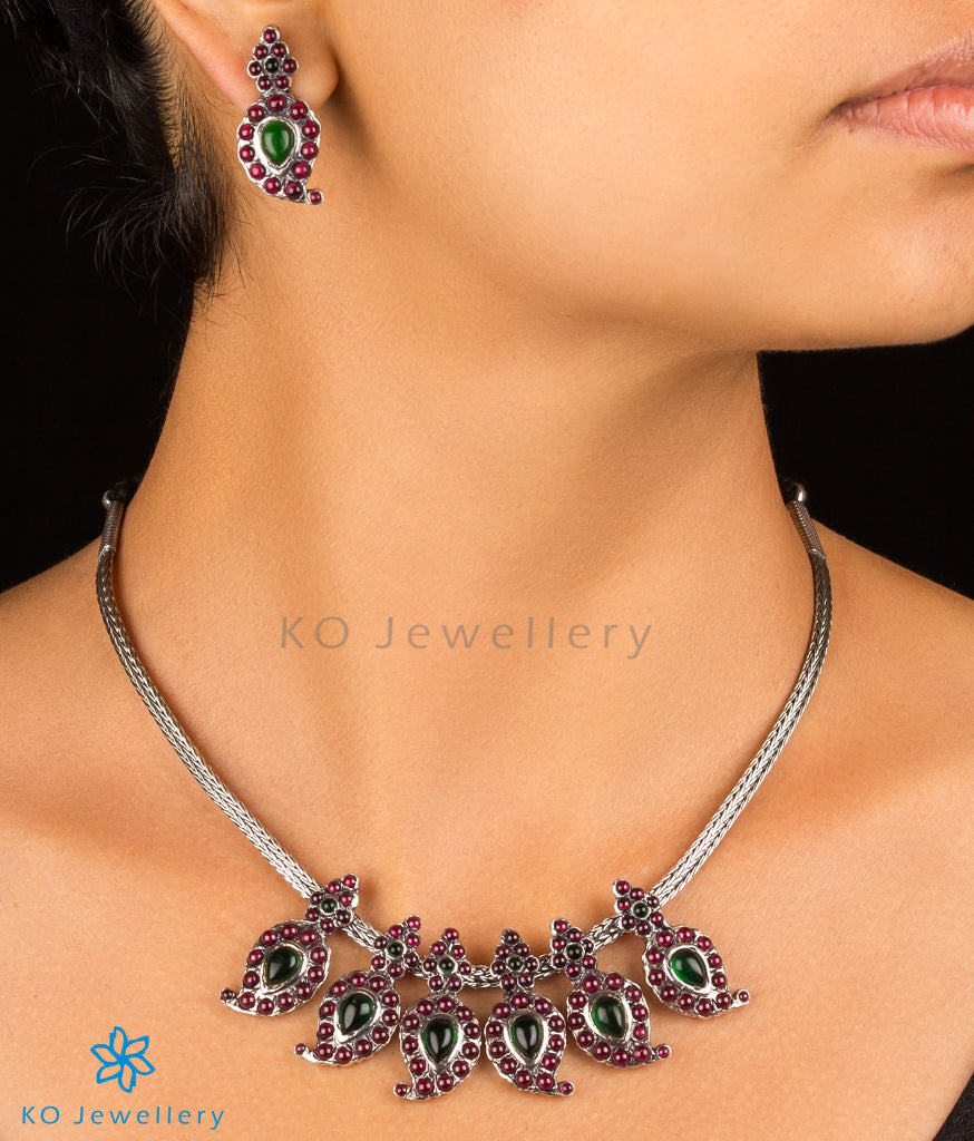 Add a pretty note to your festive wardrobe with this handcrafted Manga Malai (mango motif) necklace .Crafted using techniques used in ancient South Indian antique jewellery this exquisite necklace is studded with `kempu' (red) stones. All pieces in this collection are crafted in Sterling (92.5) Silver and oxidied in a special process to give them an antique look.This necklace comes with matching earrings.