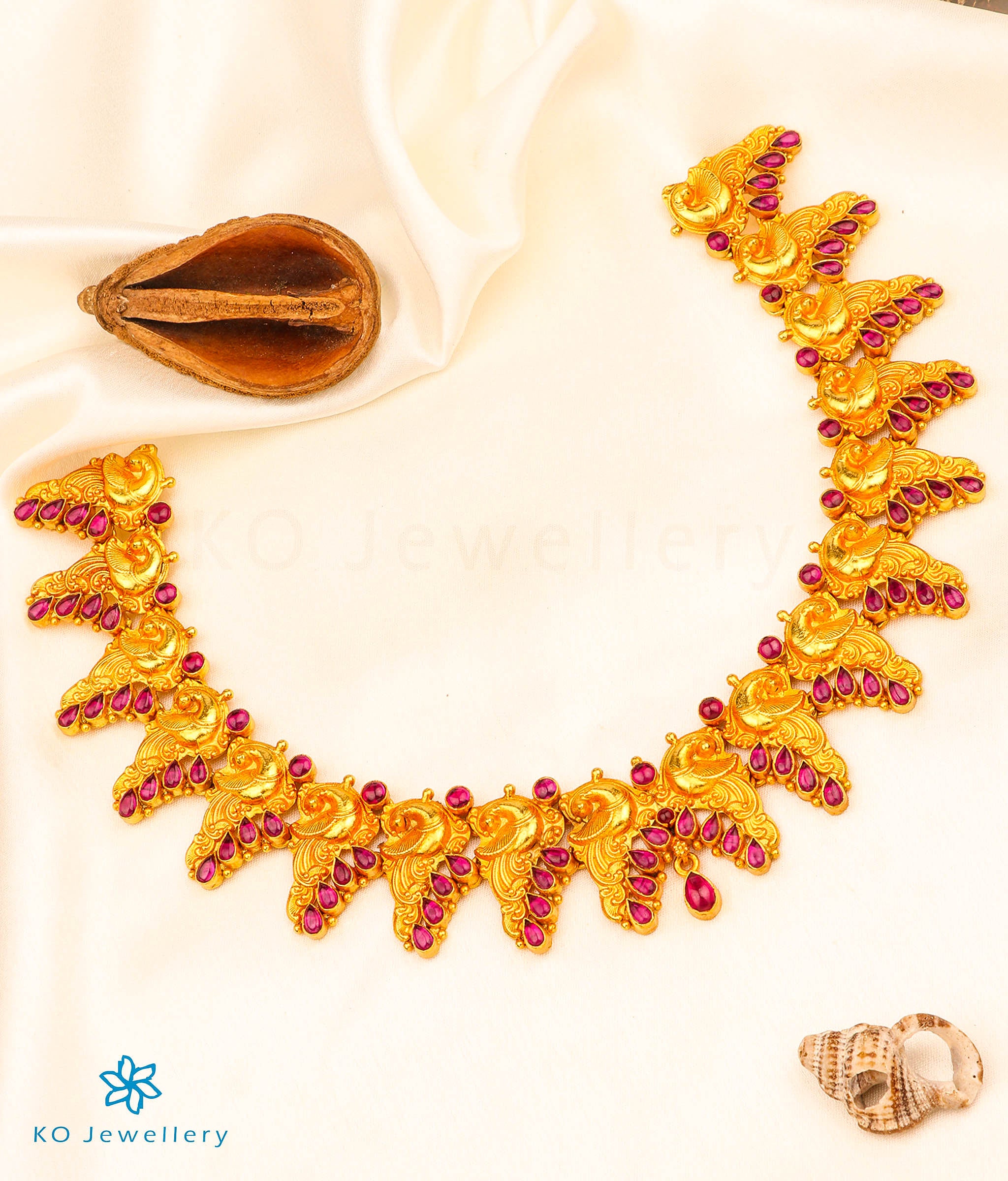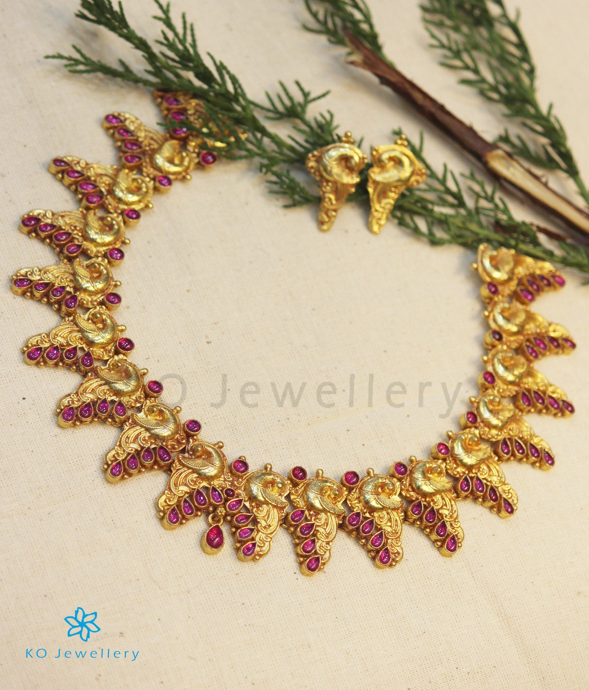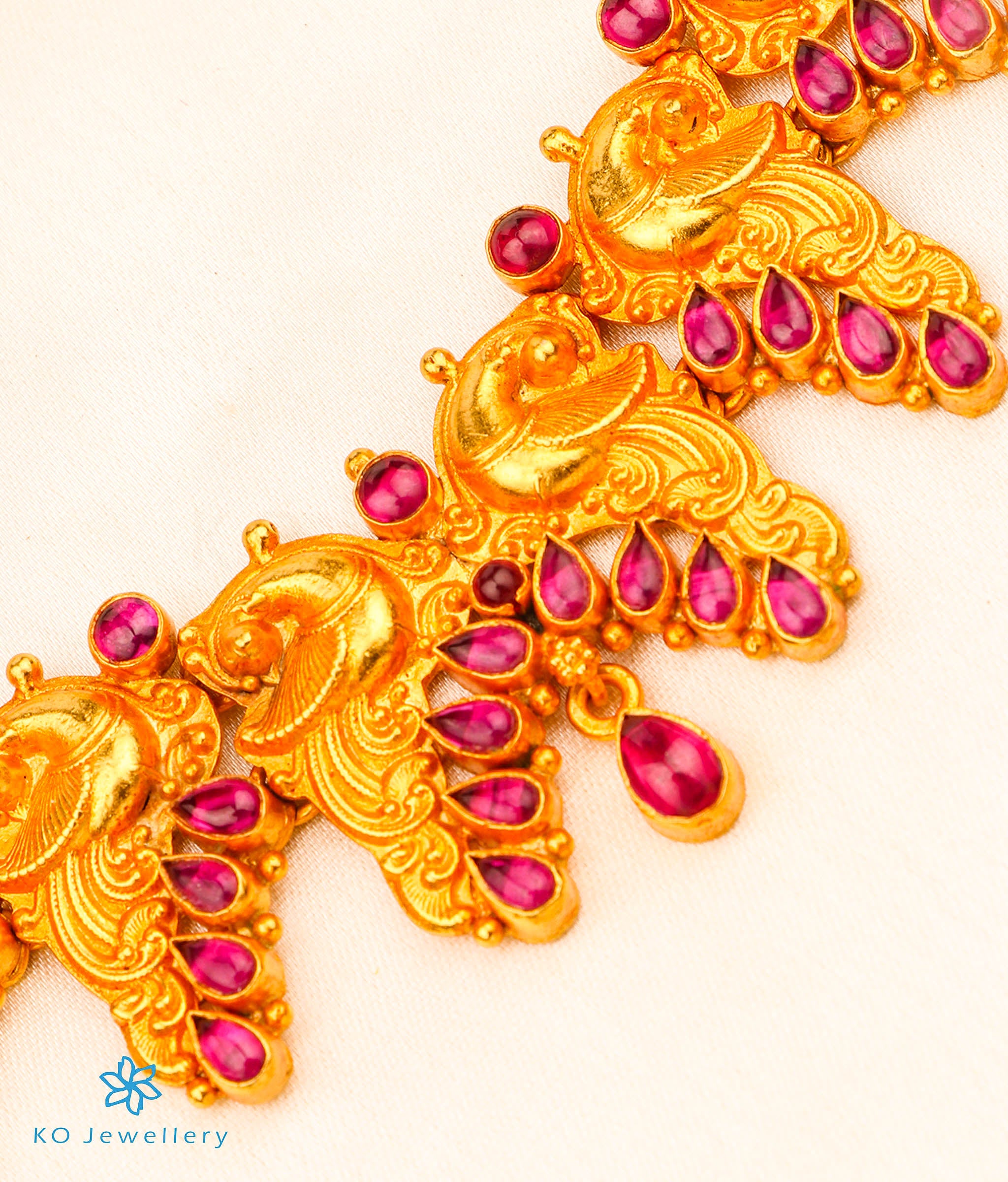 This stunning vintage necklace creates a mesmerising effect with its perfect symmetry and flawless craftsmanship.The necklace is made of numerous pendants with preening parrots highlighted with kempu stones. The gorgeous necklace and earrings are crafted in sterling silver (92.5%) and gold- dipped.