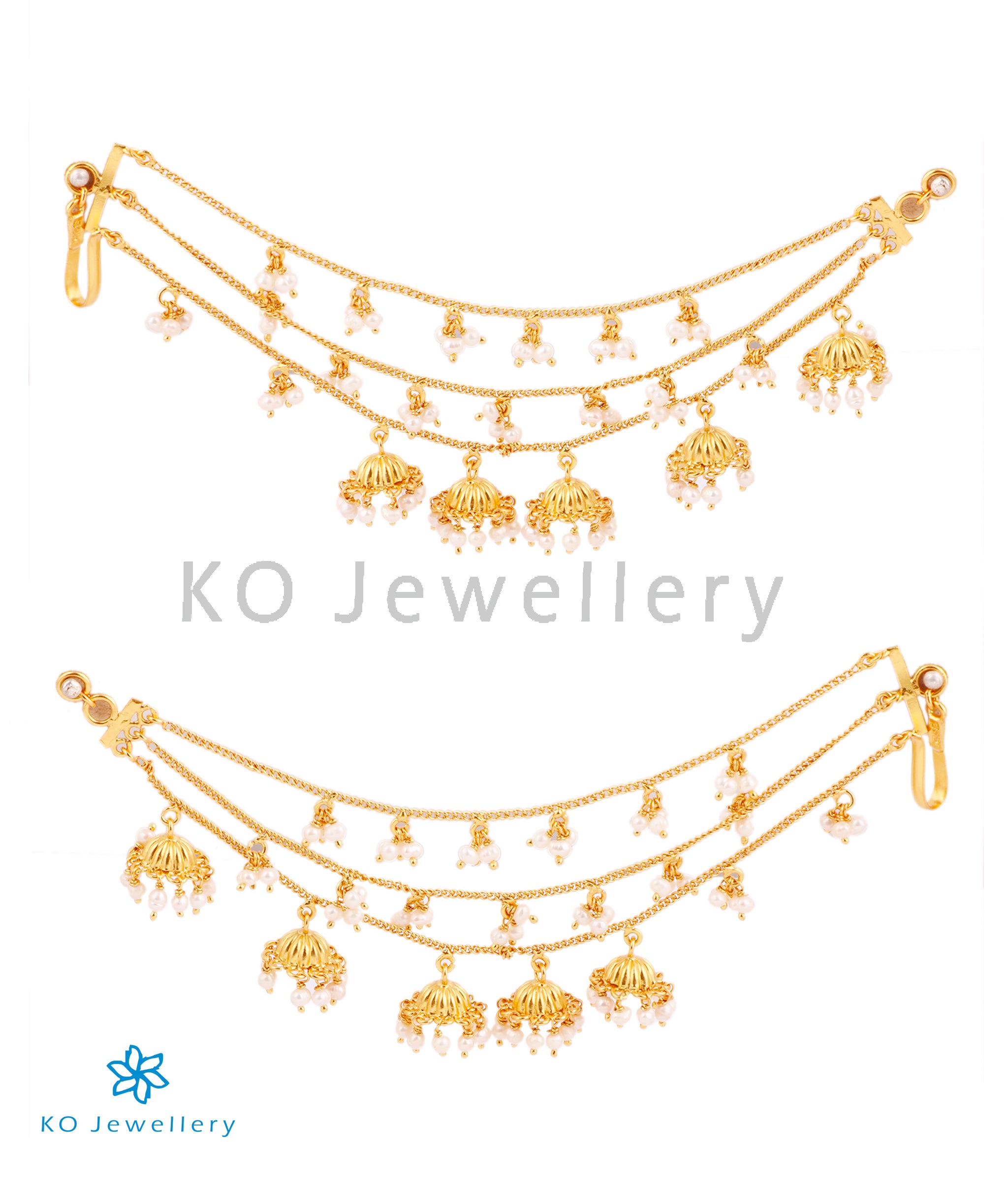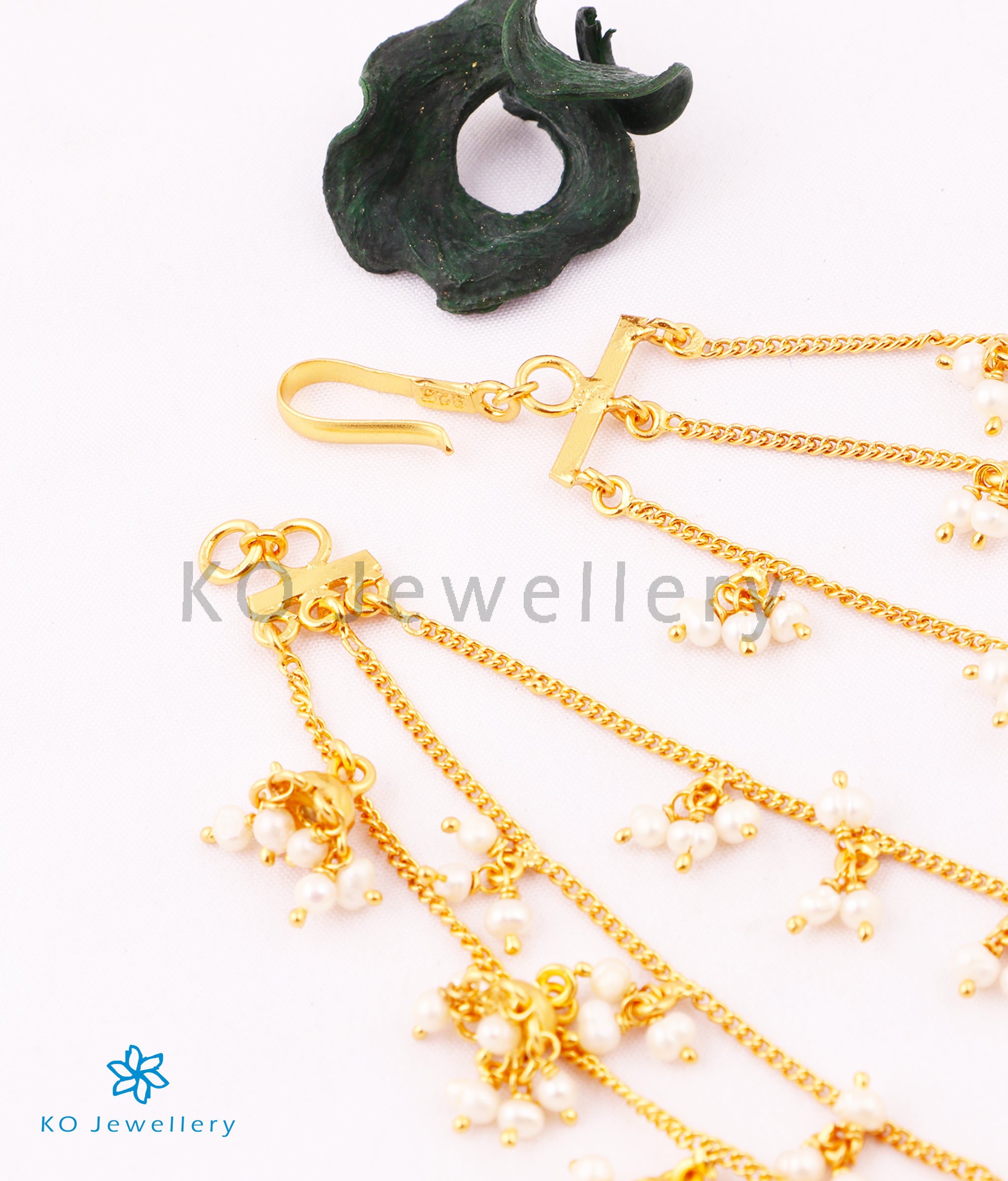 This pair of unique design gold-dipped; maatil or kaan chain with tiny jhumkis is handcrafted in Sterling silver (92.5%); decorated with pretty Pearls and tiny little jhumkas . Pair it with your traditional outfits, or style them with your indo- western outfits they look stunning .
