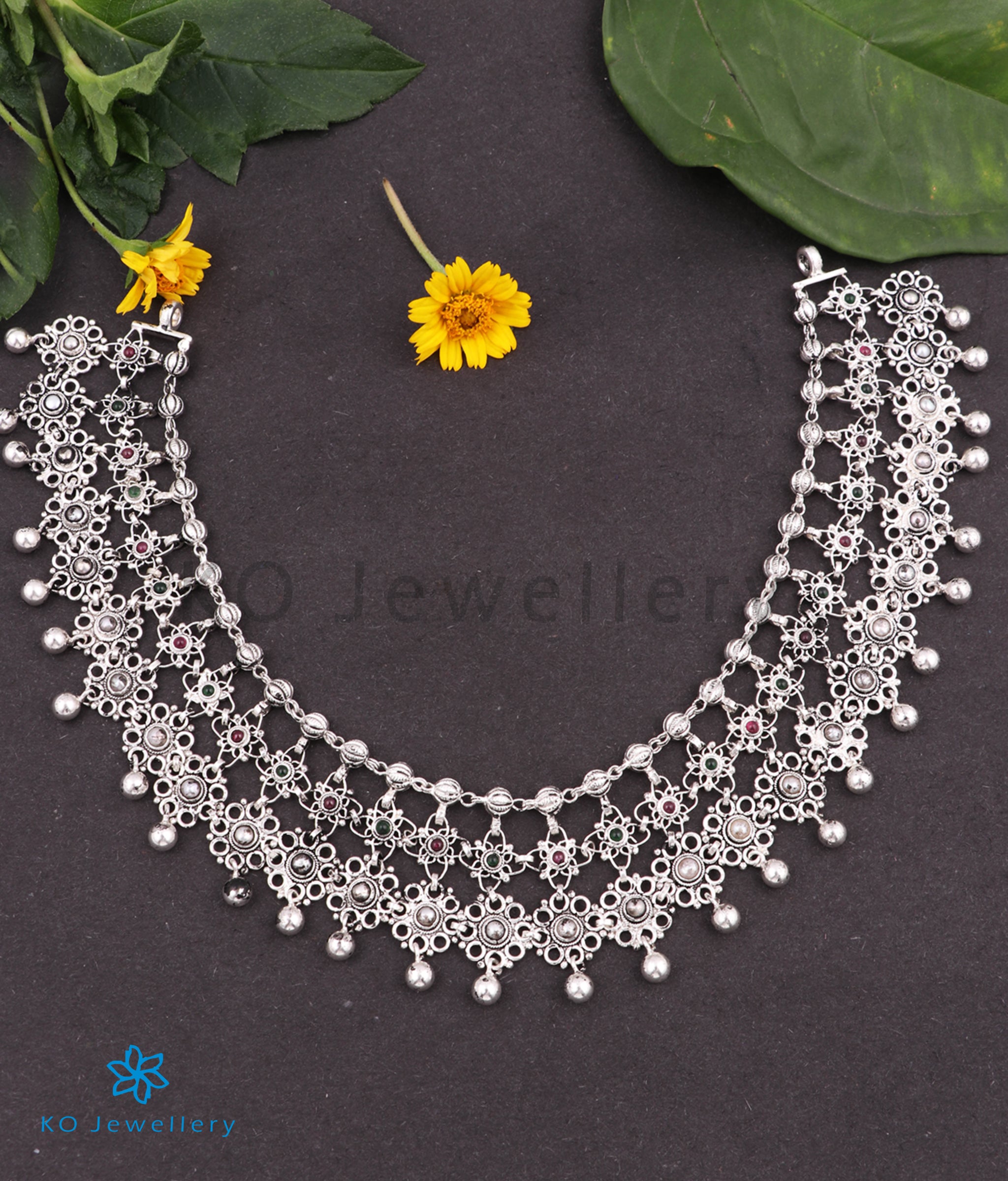This piece uses the same technique of filigree and granulation to create jewellery that is truly awe-inspiring! Crafted in Sterling Silver (92.5%) it is studded with tiny kemp stones and pearl all the minute, pieces that make up the necklace are crafted separately and then joined together with silver clasps