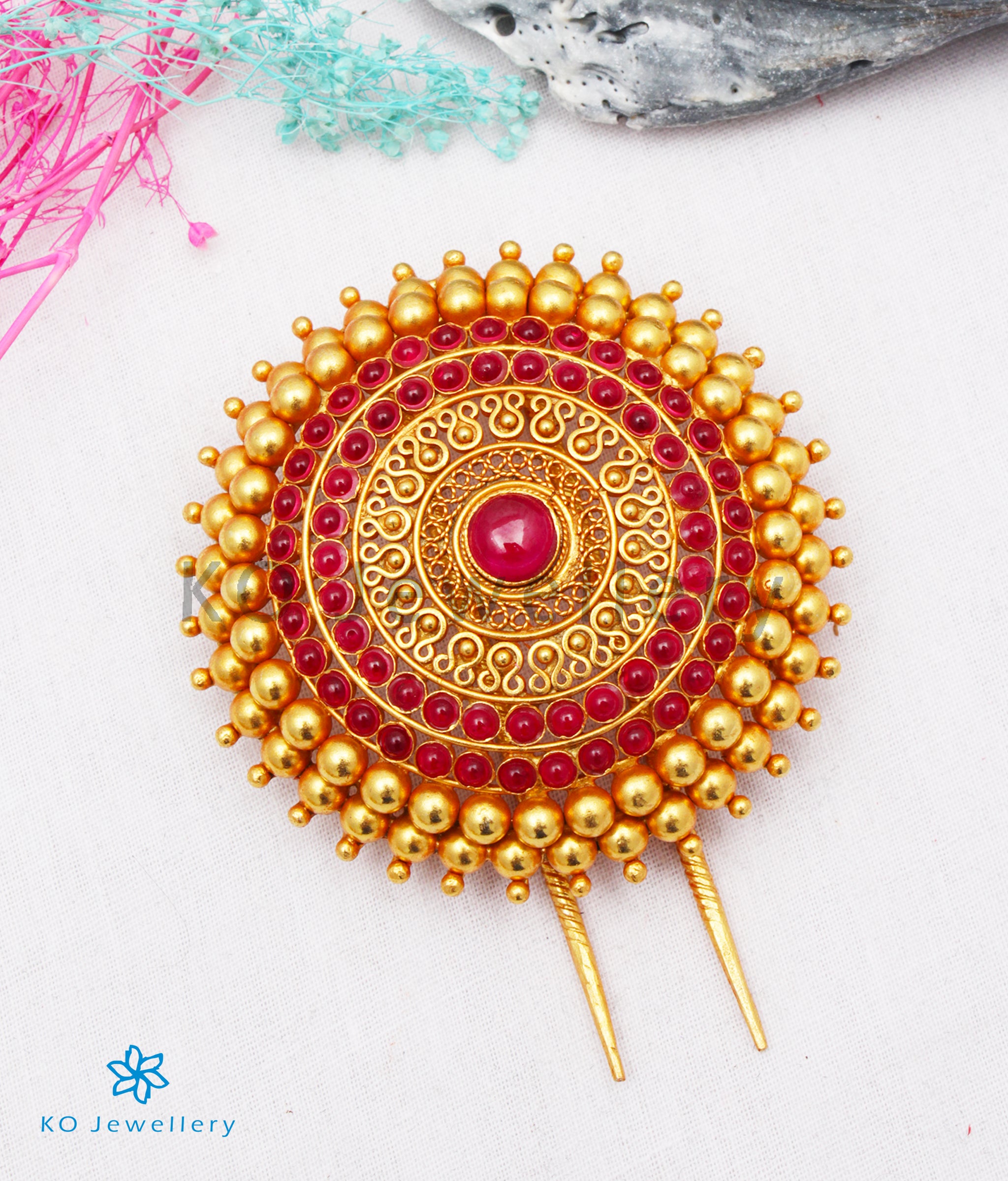 Long hair has been a mark of beauty in India and there are various pieces of jewellery to adorn long tresses. Here we have an ornate hair-clip studded with kempu stones crafted in Sterling Silver (92.5%) and gold-dipped to perfection. Crafted using techniques used in ancient South Indian antique gold temple jewellery this is a true heirloom piece of jewellery. This piece is also available in the antique silver finish on request.