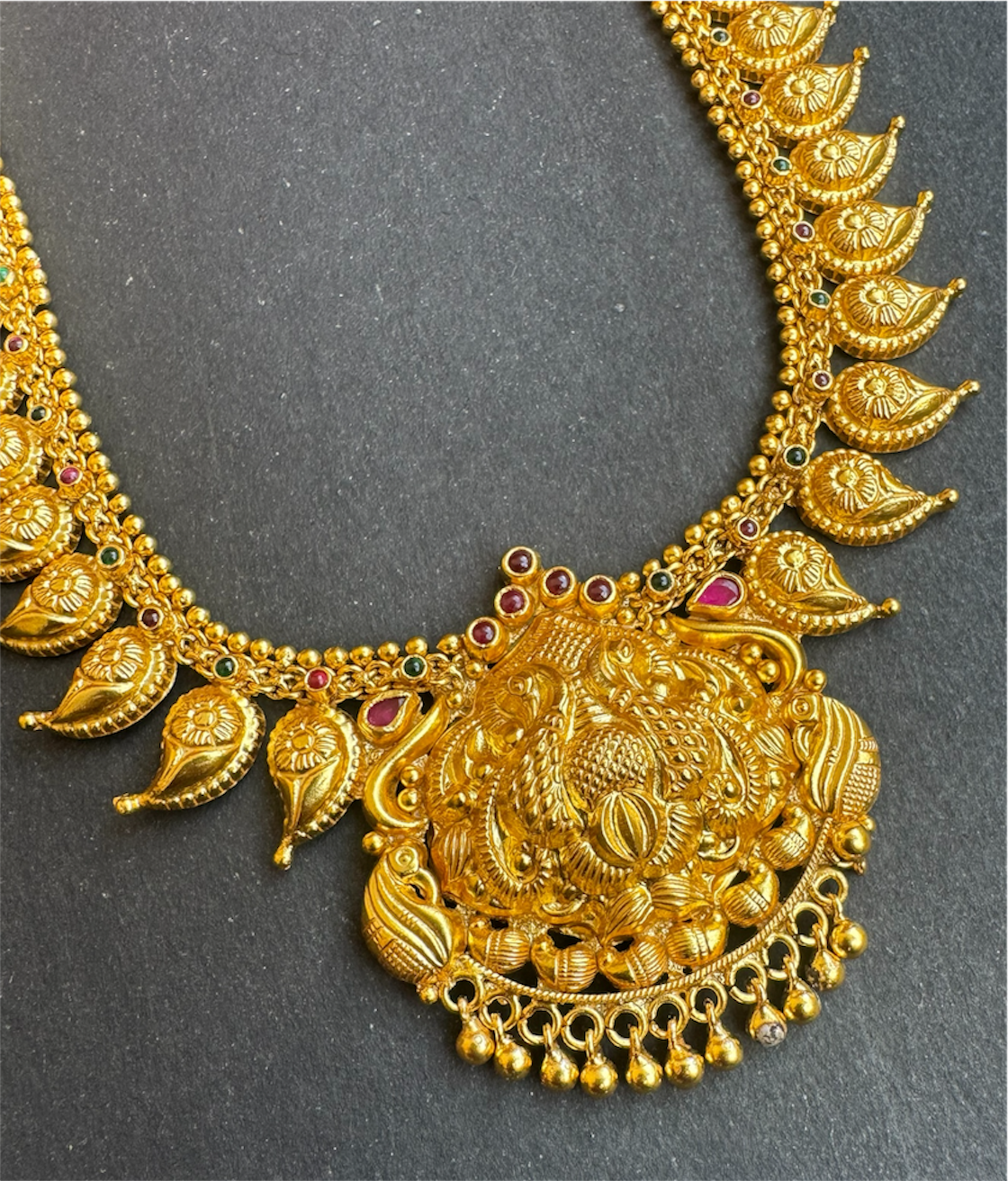 An exquisite temple-inspired haara, meticulously handcrafted in 92.5 sterling silver and enriched with 24K gold patterned detailing. The intricate nakkashi craftsmanship showcases flowing, feather-like motifs that echo the timeless elegance of classical South Indian artistry.