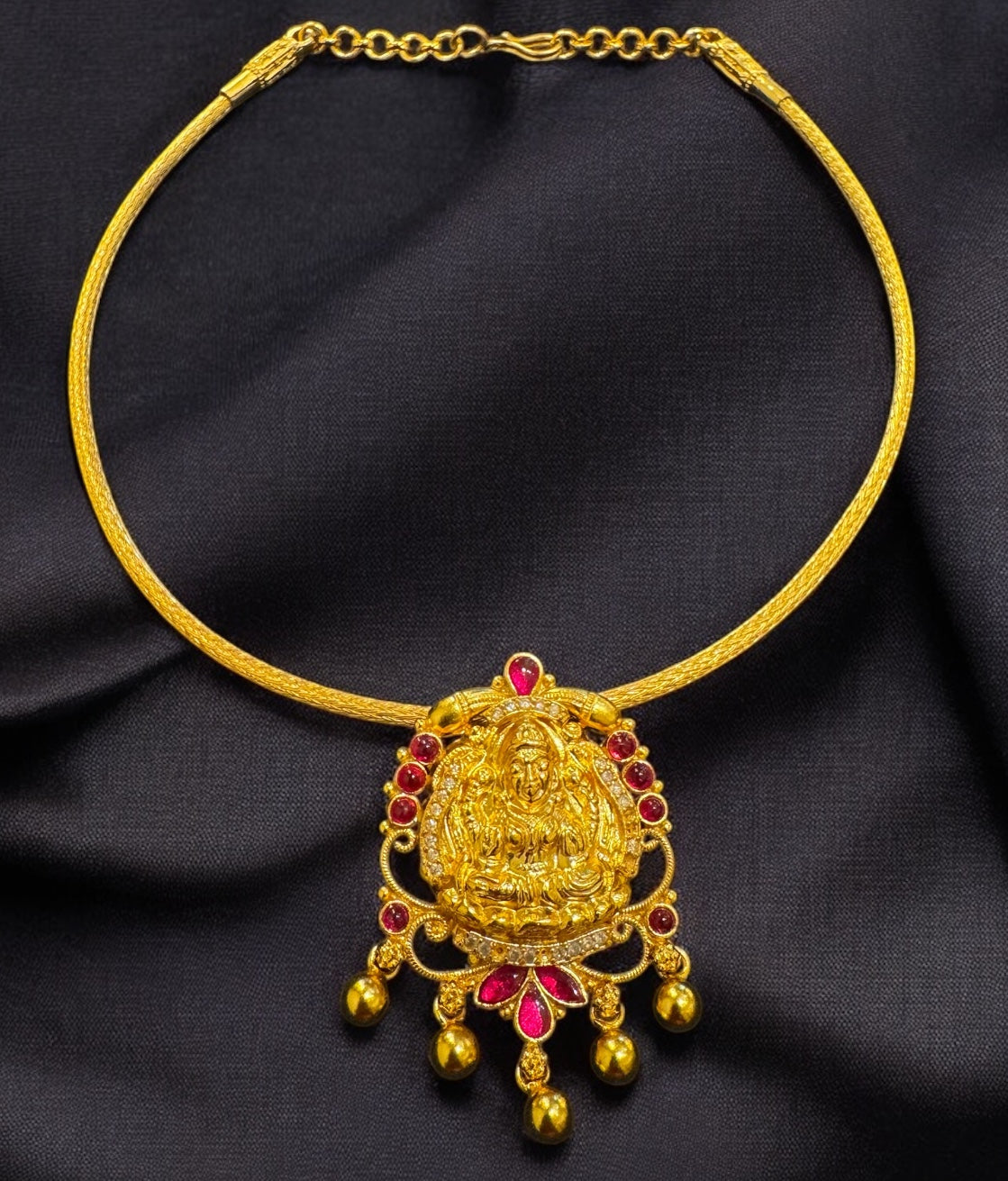 A small and ornate Lakshmi motif pendant with an irresistable charm. Crafted using techhniques used in ancient South Indian antique gold temple jewellery the entire piece is crafted in pure Sterling silver(92.5%) and gold dipped.